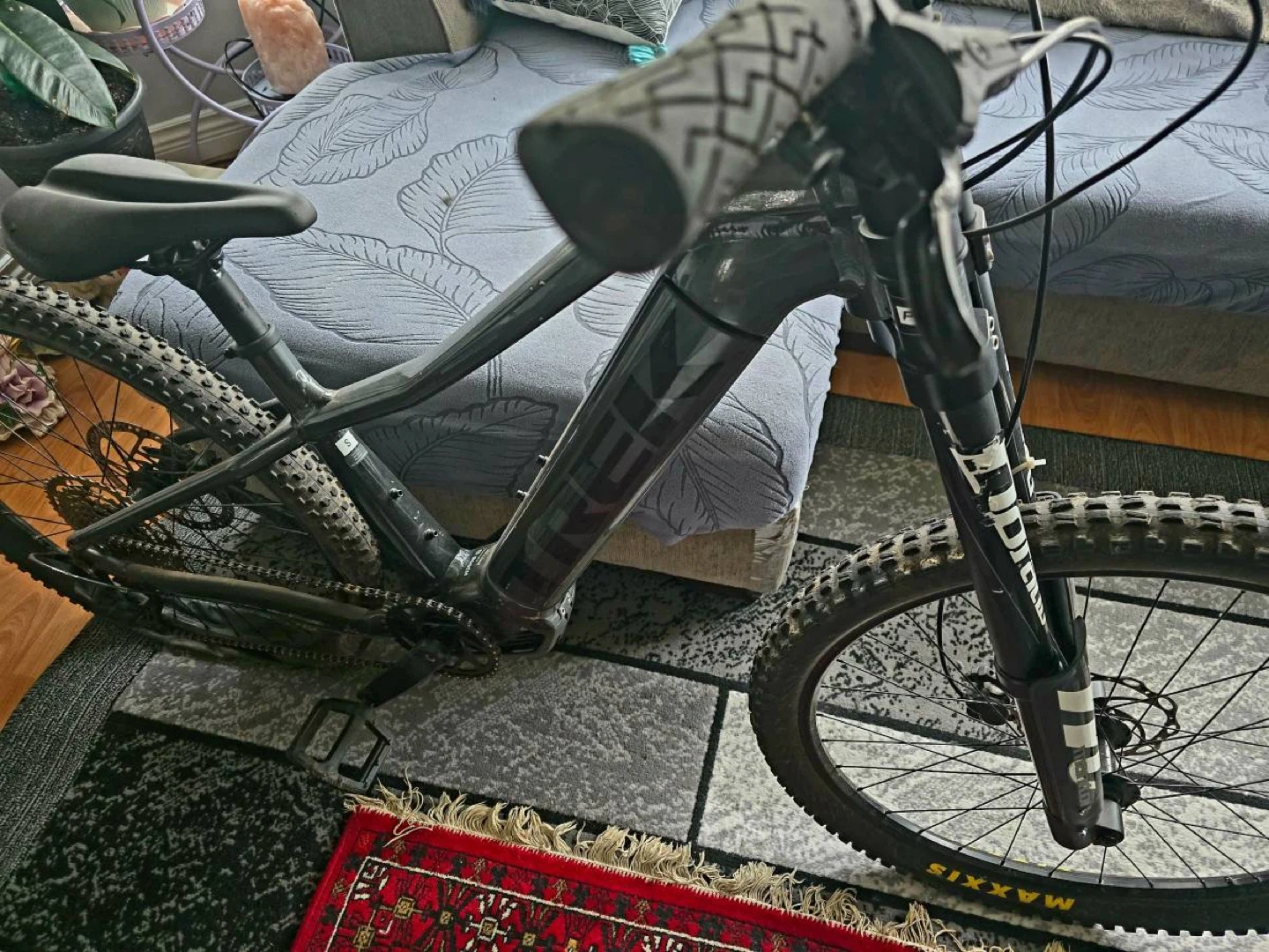 This is a Trek Powerfly FS 4 Gen 3 electric mountain bike. It's a full-suspension e-bike built for tackling trails. Includes integrated battery and motor system.