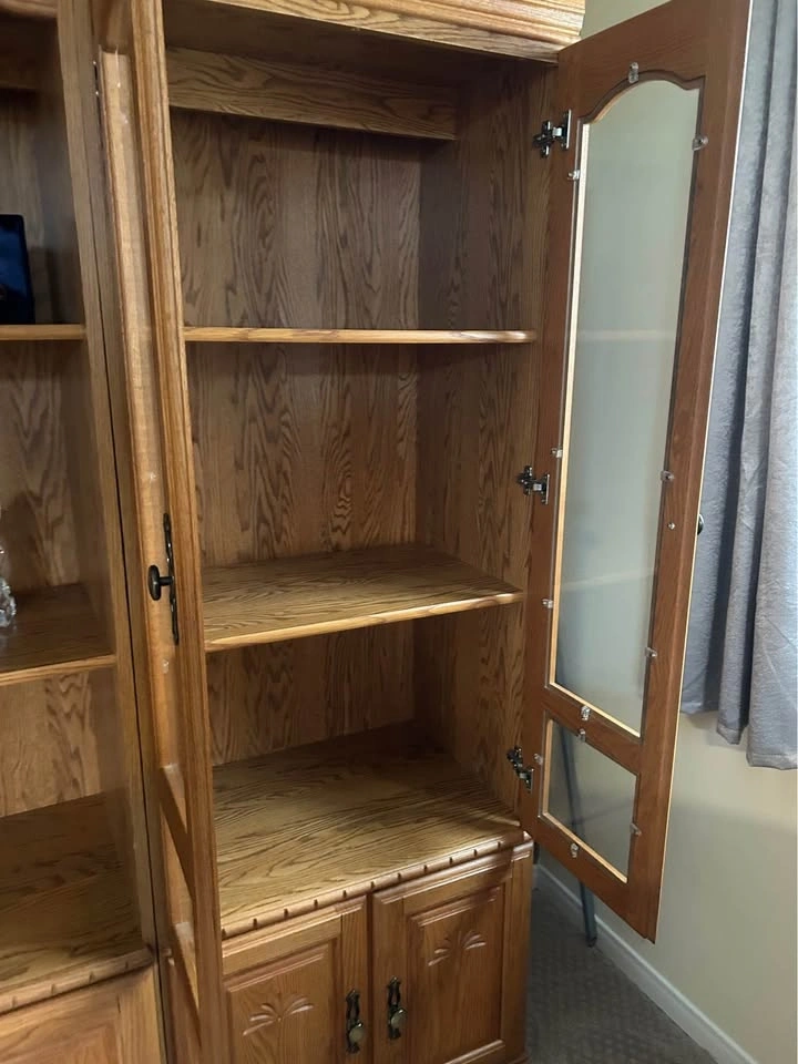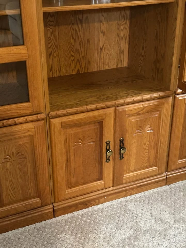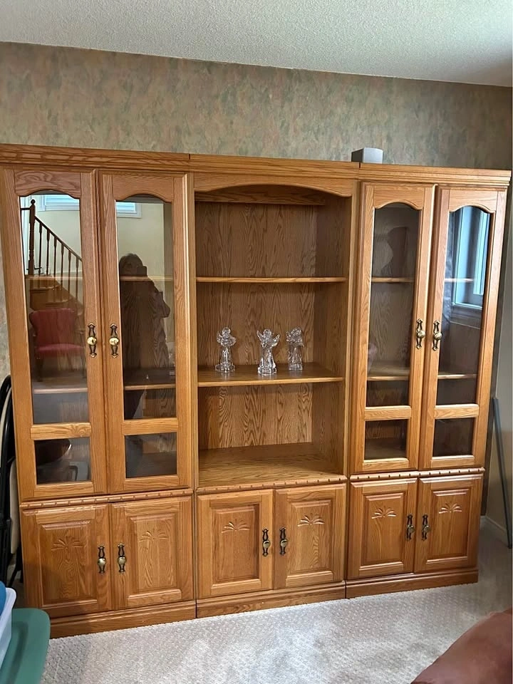Light-colored wood entertainment center with multiple cabinets and shelves. Features glass doors and metal handles. Dimensions are 75" high, 81" wide, and 19" deep. It has three sections, each 27 inches wide, making the total width 81 inches. This is a very large piece. Pick up is in Bowmanville. You must take it apart and move it yourself.