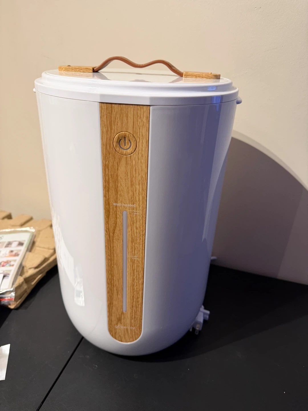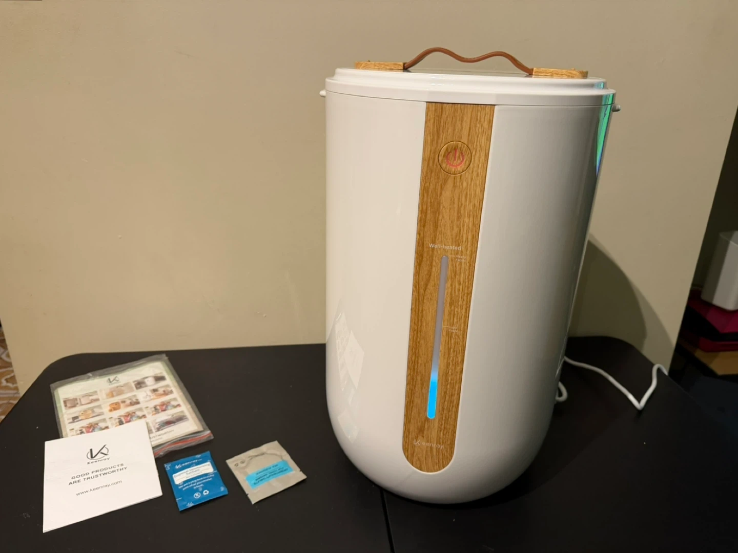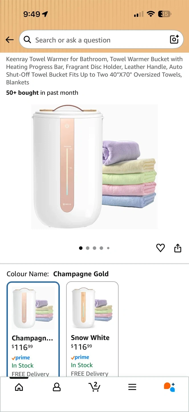 This Keenray towel warmer is in Champagne Gold. It's designed for the bathroom and can fit up to two 40"x70" oversized towels or blankets. It includes a fragrant disc holder and an auto shut-off feature.