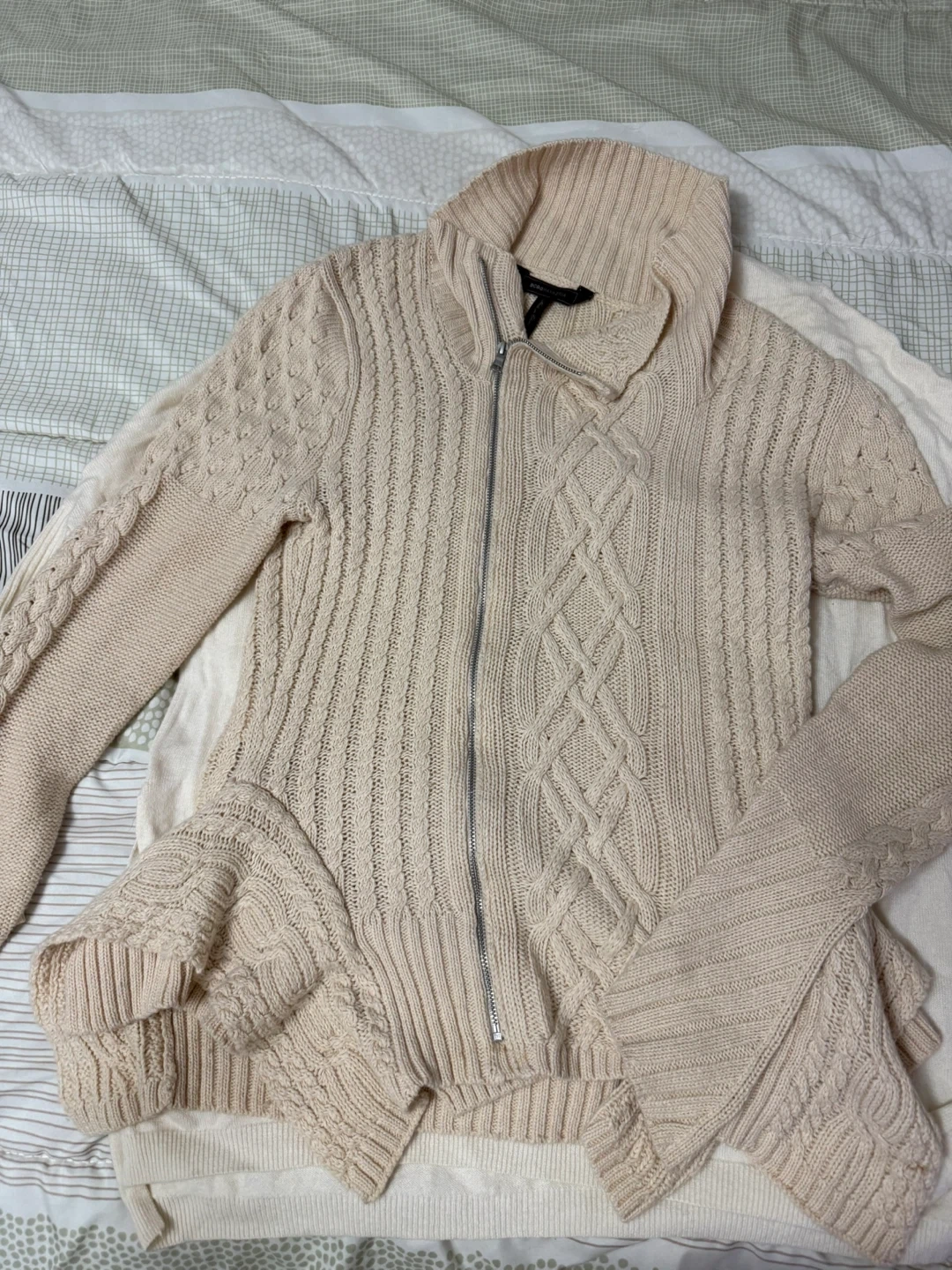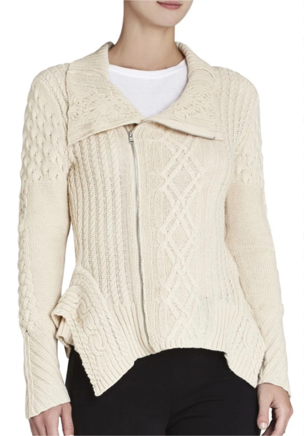 Cozy up in this BCBGMAXAZRIA Zanzi cable knit moto sweater! It's a beautiful cream colour and features a stylish asymmetrical hem. Size M. Perfect for layering or wearing on its own