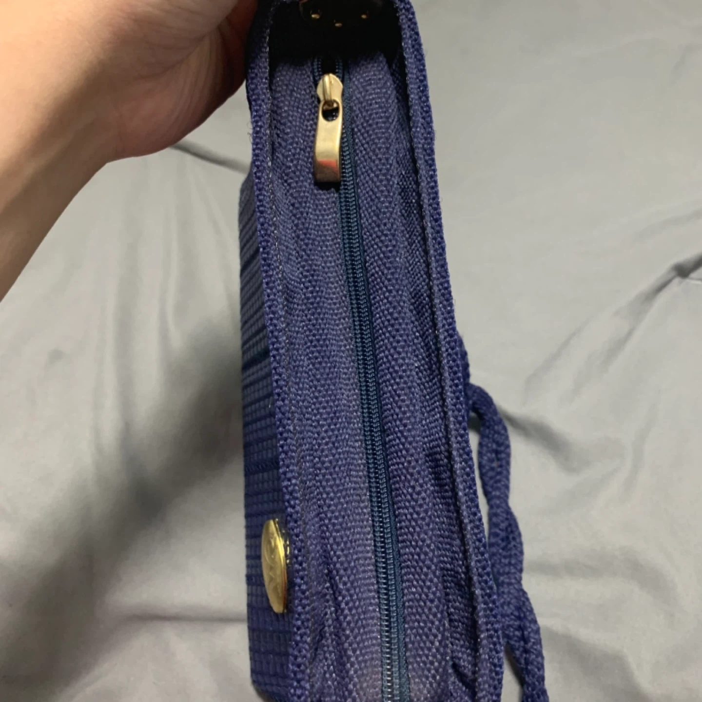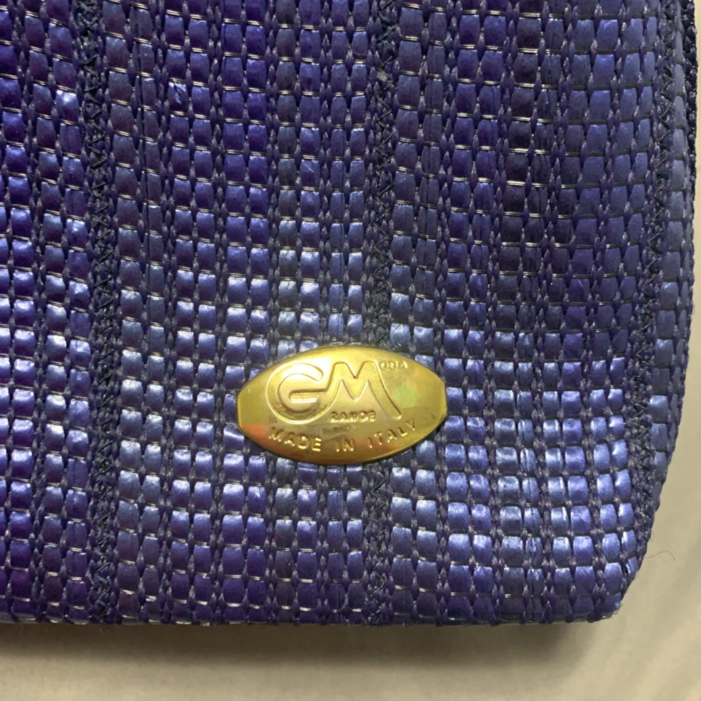 This is a blue woven shoulder bag from EM MODE Milano. It's made in Italy and features a braided strap and gold-toned hardware. The woven texture has a subtle shimmer.