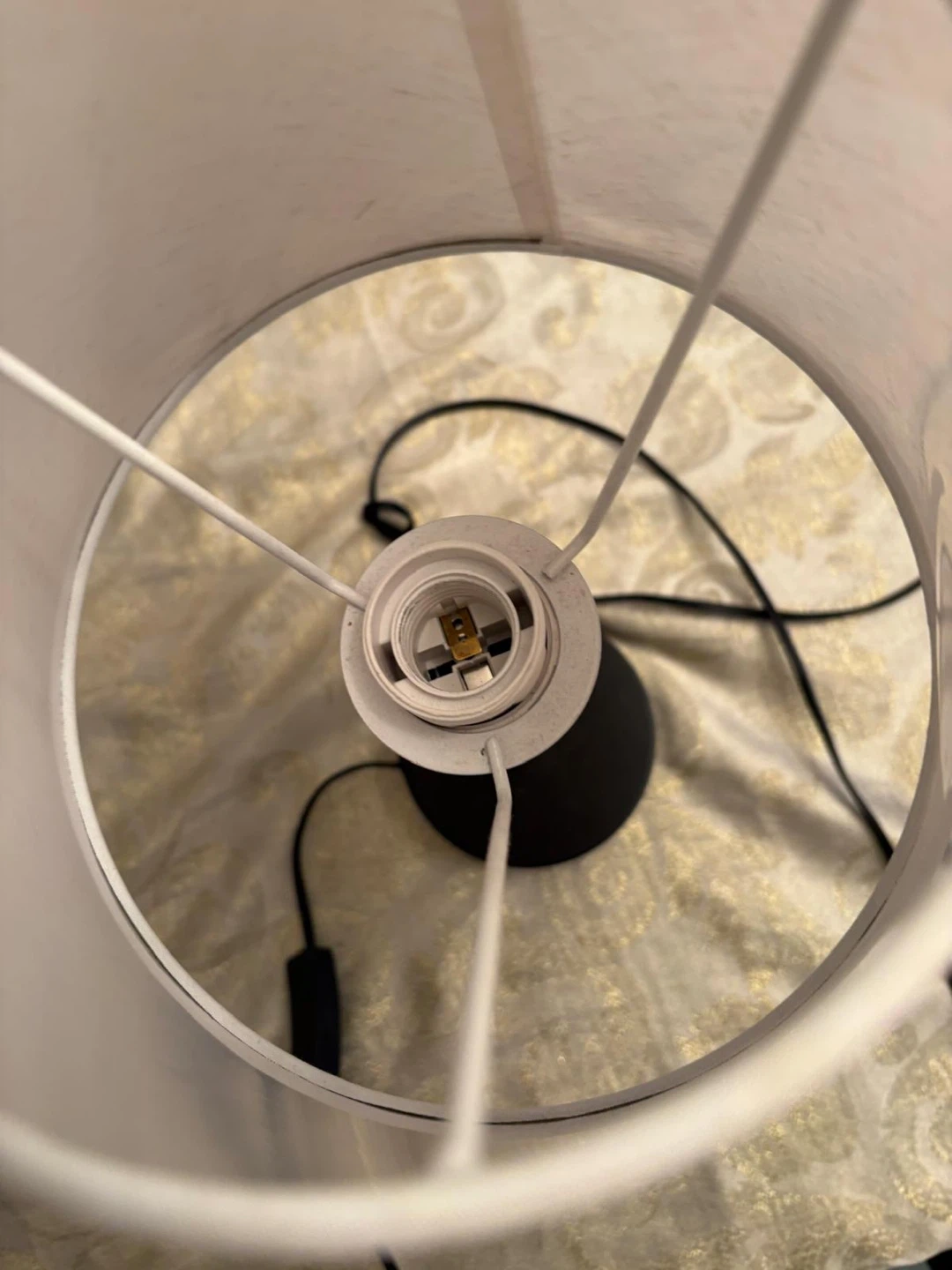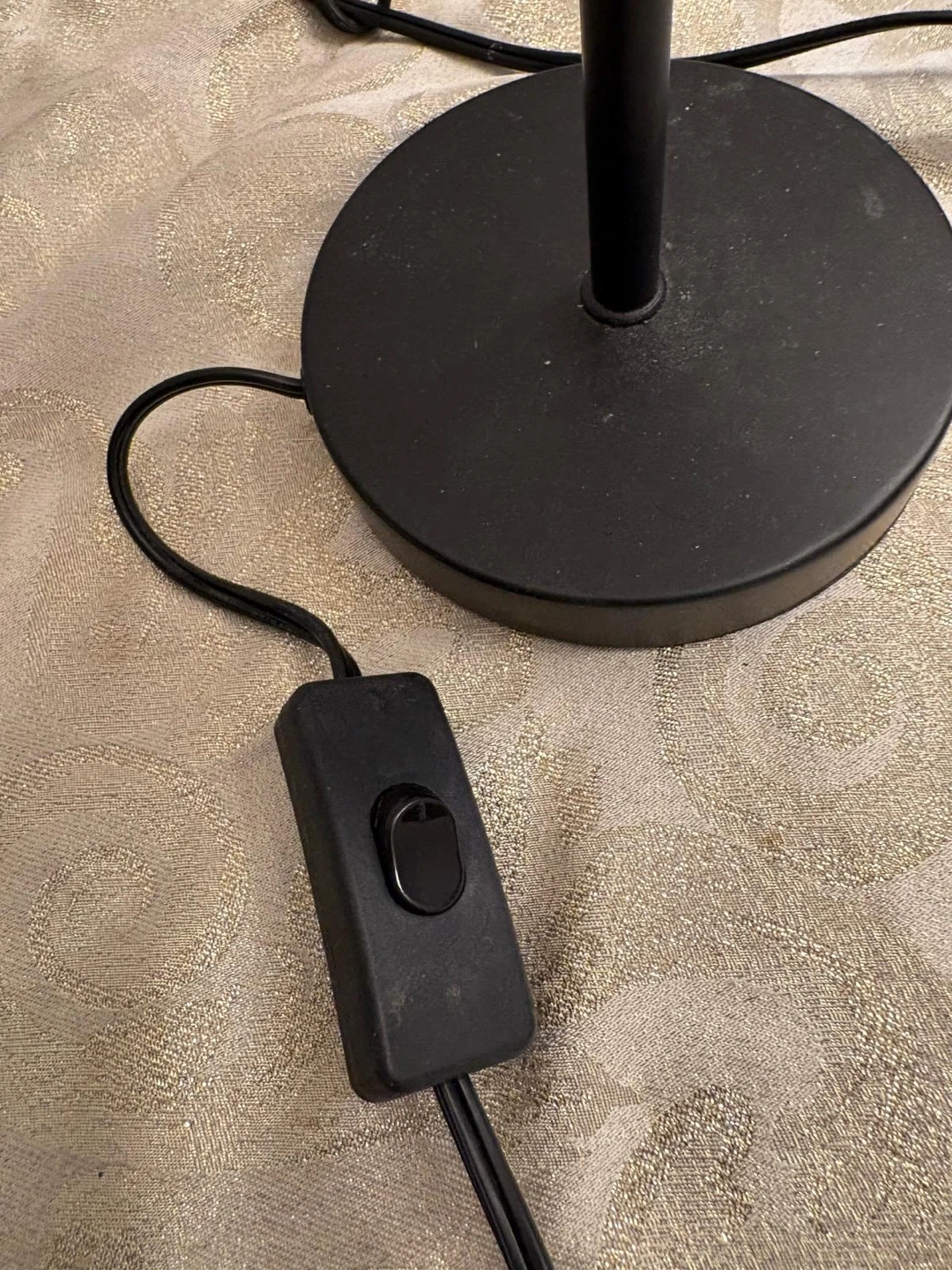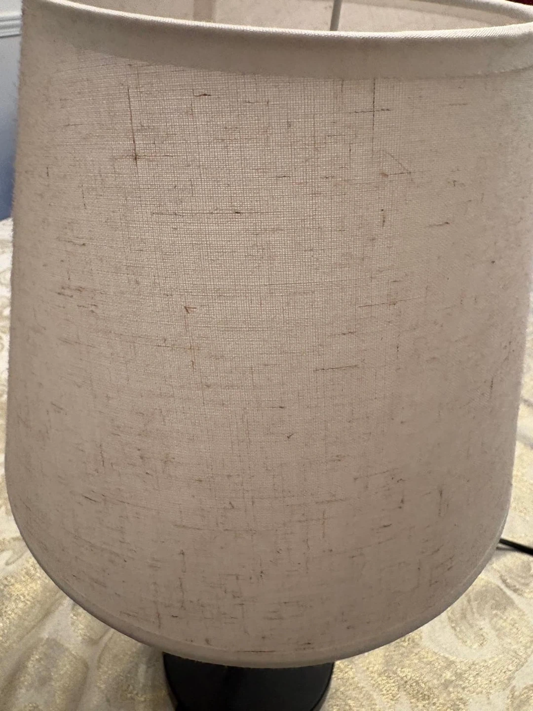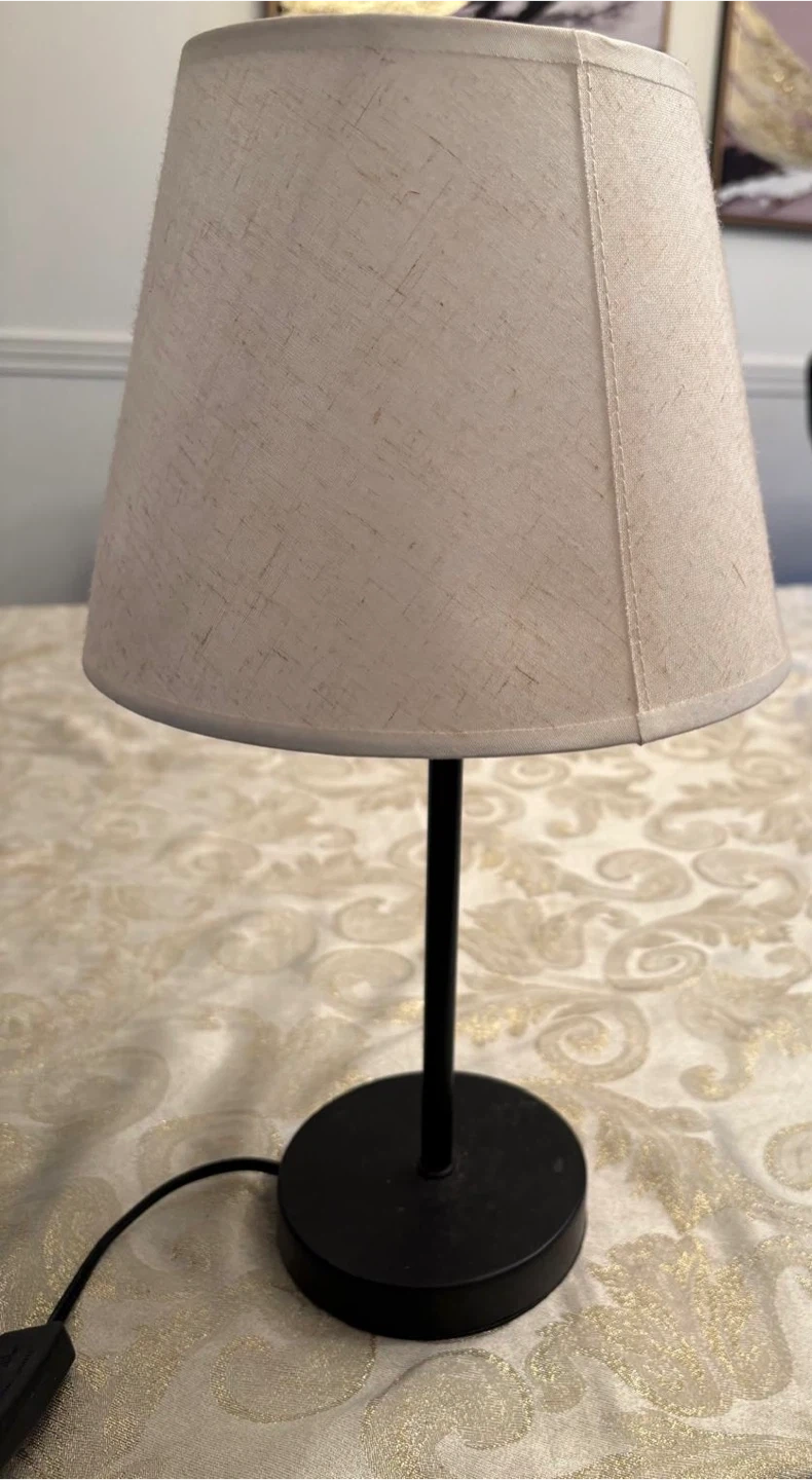 This is a small table lamp with a beige fabric shade and a black base. It's powered by a cord with an inline switch. The shade is conical in shape.