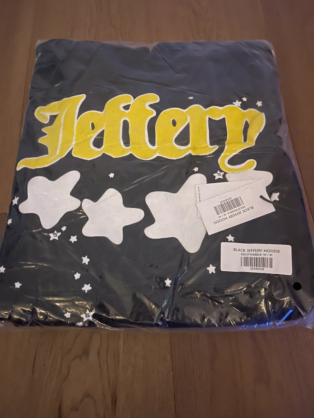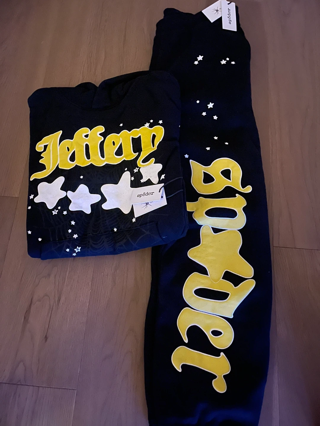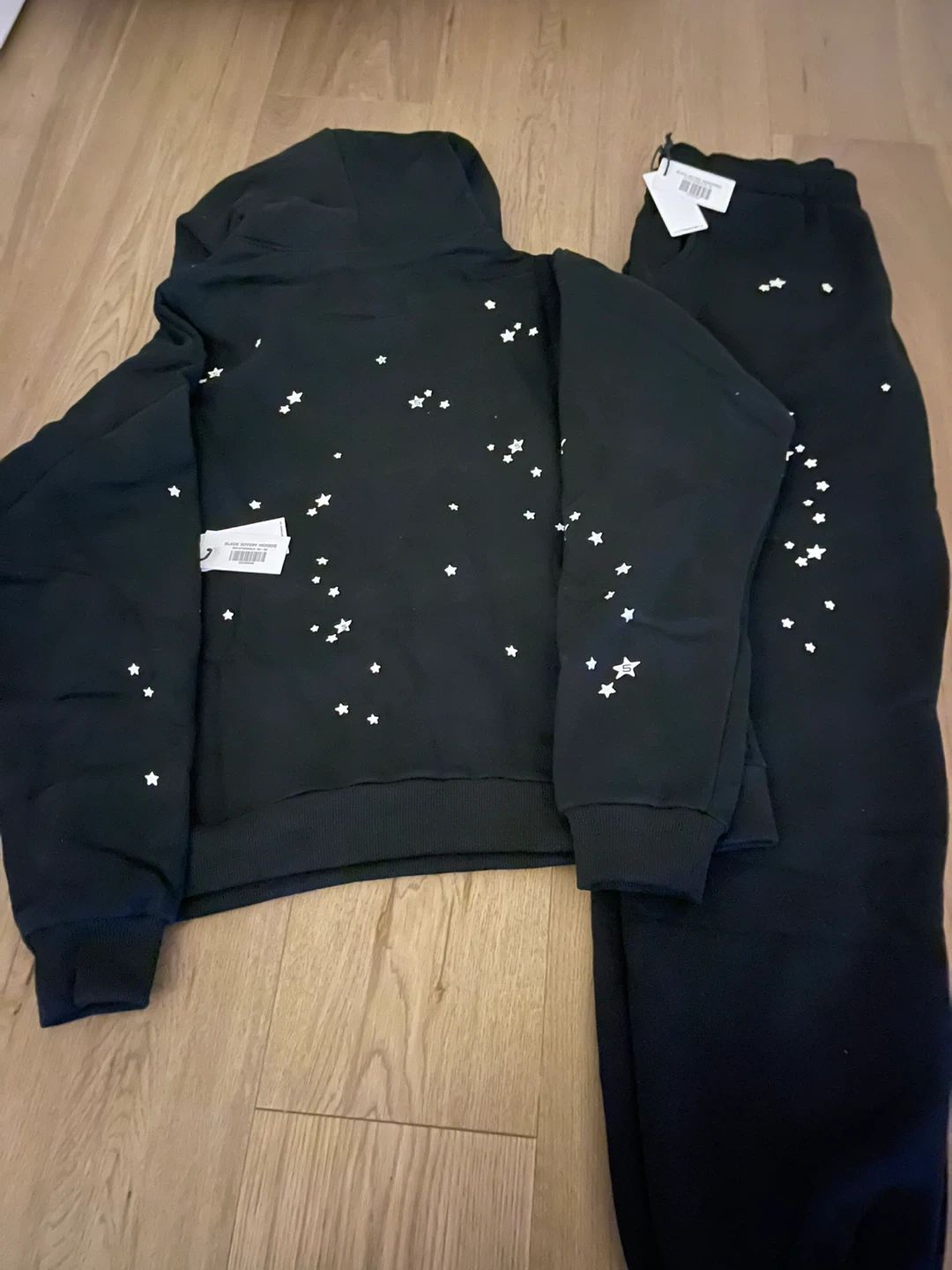 Black Spider tracksuit set. Includes a hoodie and sweatpants. Both pieces feature white star detailing and the 'Spider' graphic on the pants. Made from a cotton blend material.