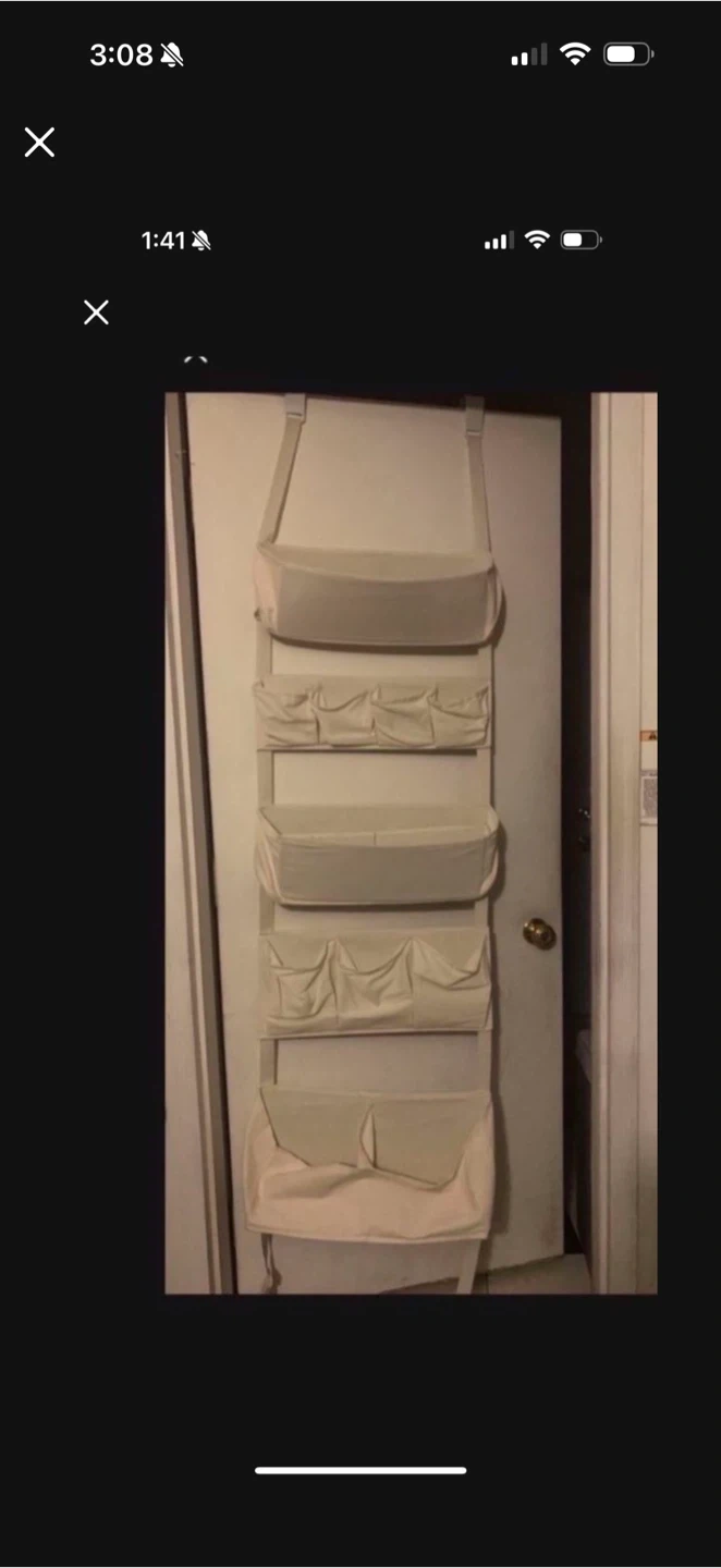 This is an over-the-door organizer with several pockets. It hangs from the top of a door and has multiple compartments for storage. The color is a neutral beige and it appears to be made of fabric.