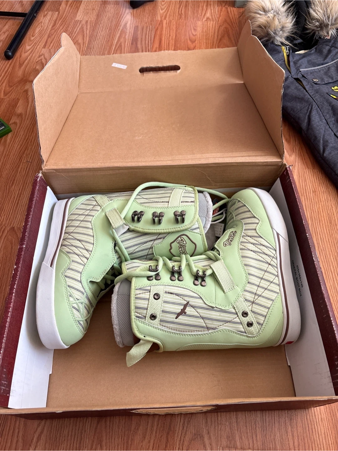These are Vans snowboard boots in a light green colour. They come in their original box and feature a secure lacing system. These boots are designed for snowboarding performance.
