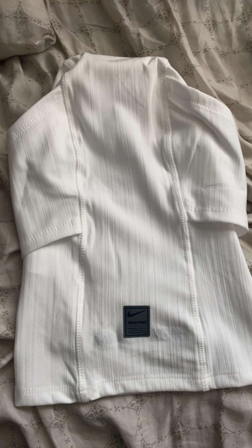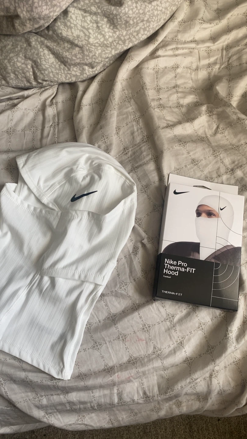 This is a white Nike Pro Therma-FIT Hood, designed for athletic performance. It's made with Therma-FIT technology to help keep you warm. The hood provides full head coverage.