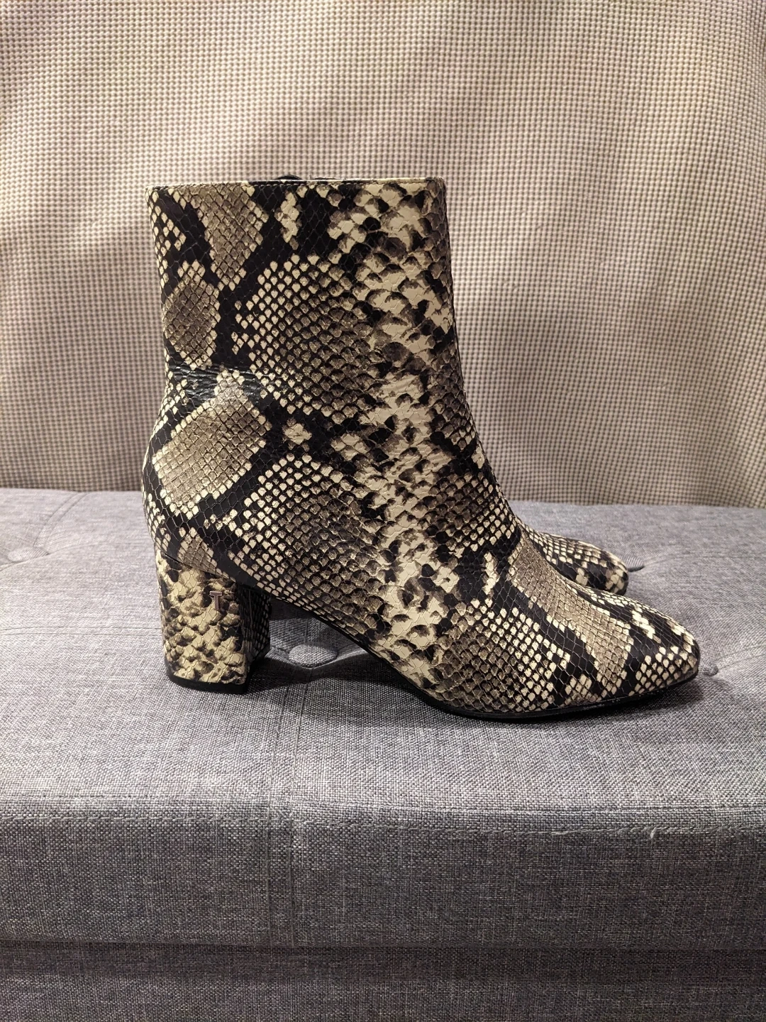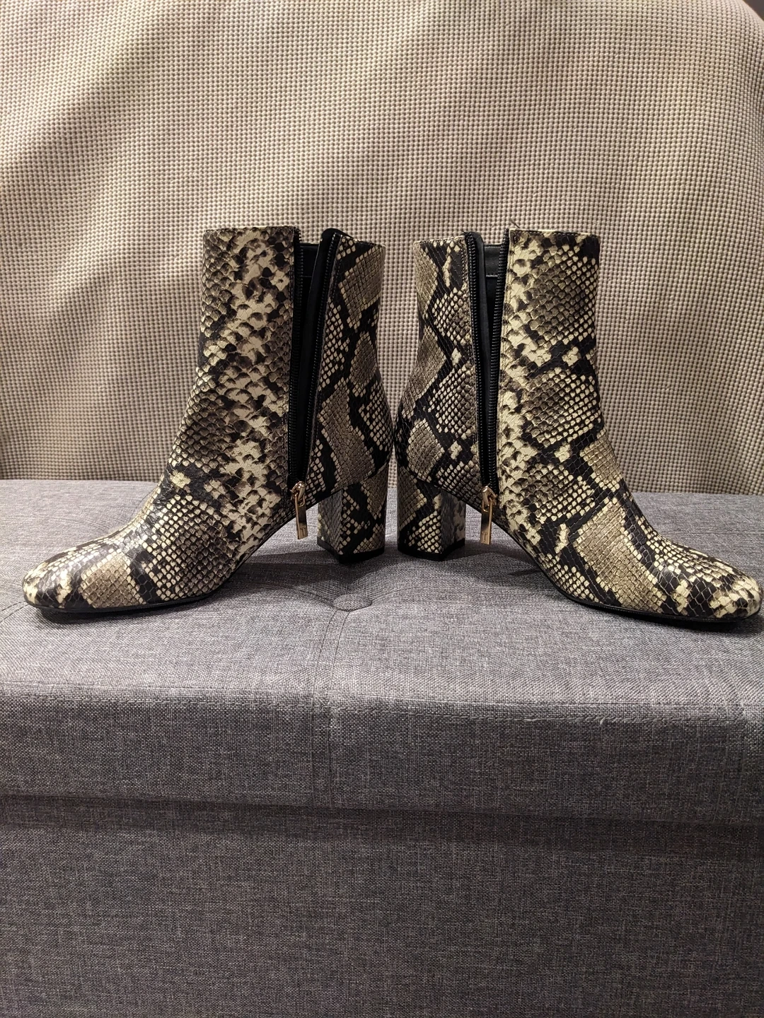 Ted Baker size 7 ankle boots with a trendy snake print design. These feature a stylish block heel and a side zipper for easy on and off.