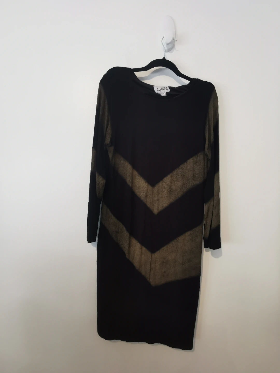 Joseph Ribkoff long-sleeved black dress with a striking olive green chevron pattern. Size 14 (CAN/USA). It's made of a stretchy, comfortable fabric.