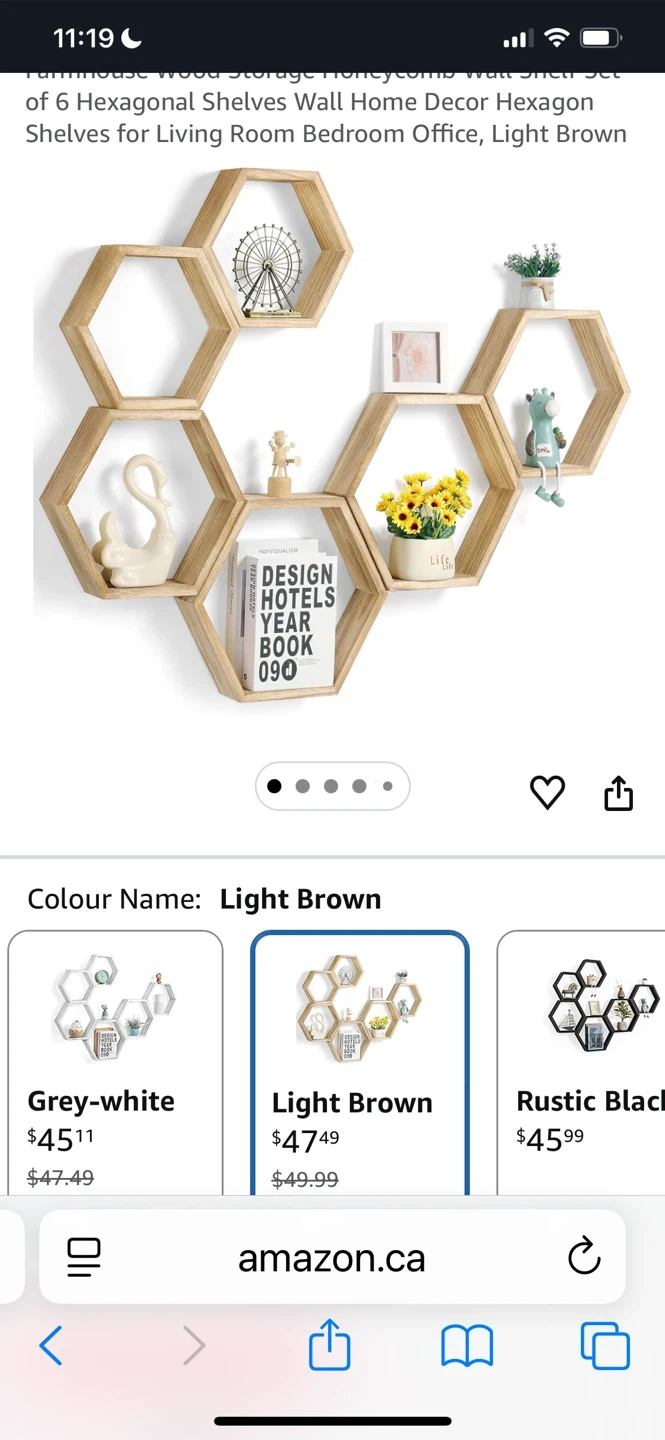 Farmhouse wood storage honeycomb wall shelf set. Includes 6 hexagonal shelves in a light brown finish. Wall-mounted design with non-slip mats. Perfect for organizing and decorating your living room or office!