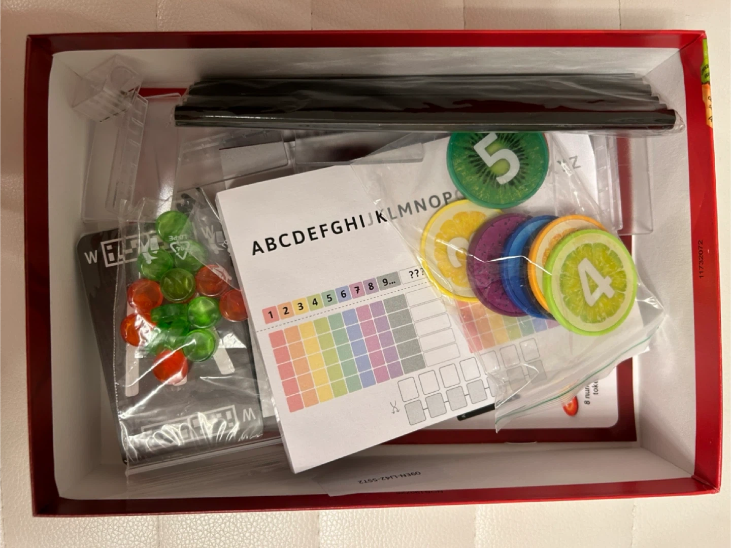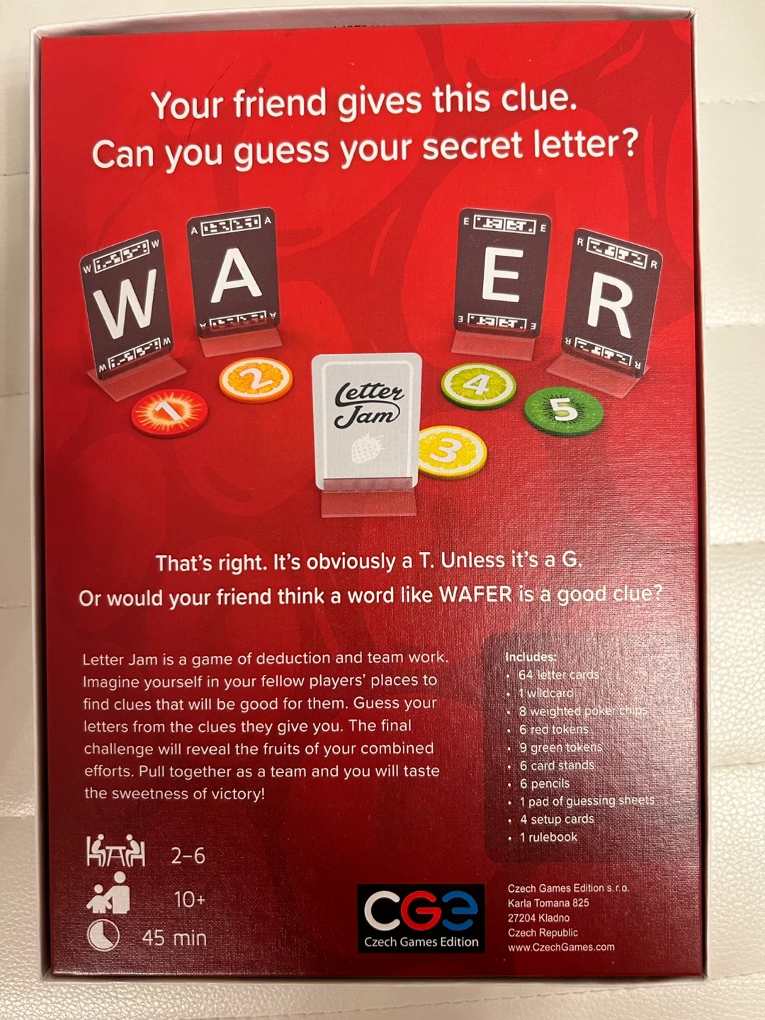 This is the cooperative word game Letter Jam. It includes 64 letter cards, 1 wildcard, 8 weighted poker chips, 6 red tokens, 9 green tokens, 8 card stands, 10 pencils, 4 pad of guessing sheets, 4 setup cards, and 1 rulebook. It's a fun game for 2-6 players and takes about 45 minutes to play.