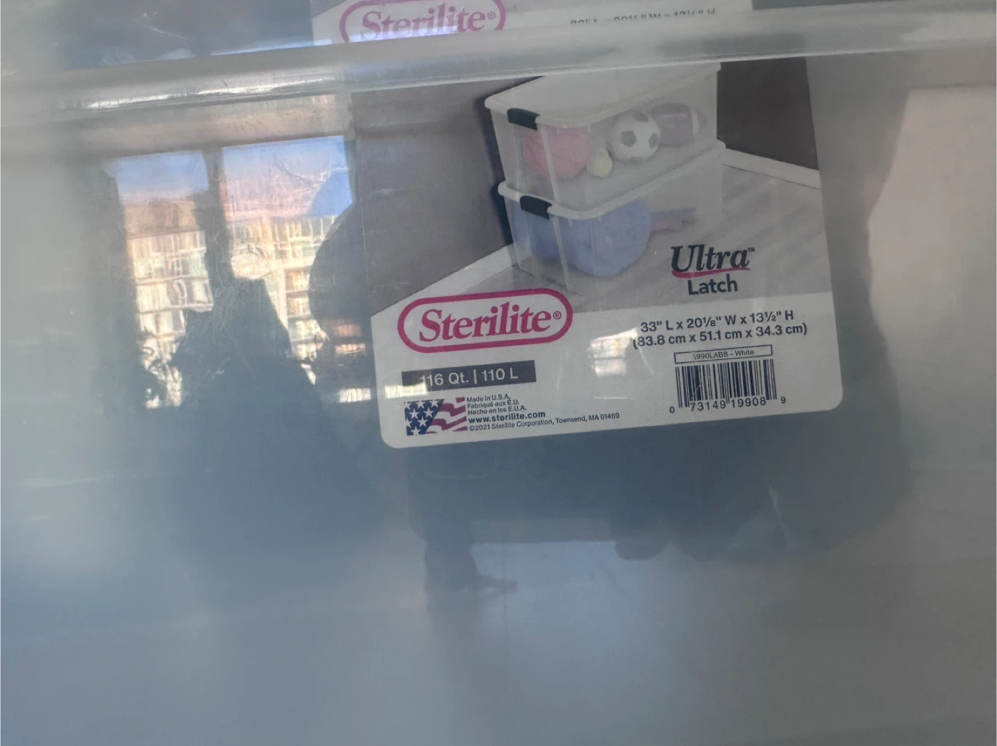 This is a Sterilite 110 L storage container with plastic lids. It's part of the Ultra Latch line. Dimensions are 33" L x 20.5" W x 13.5" H. It's made of clear plastic with white latches.