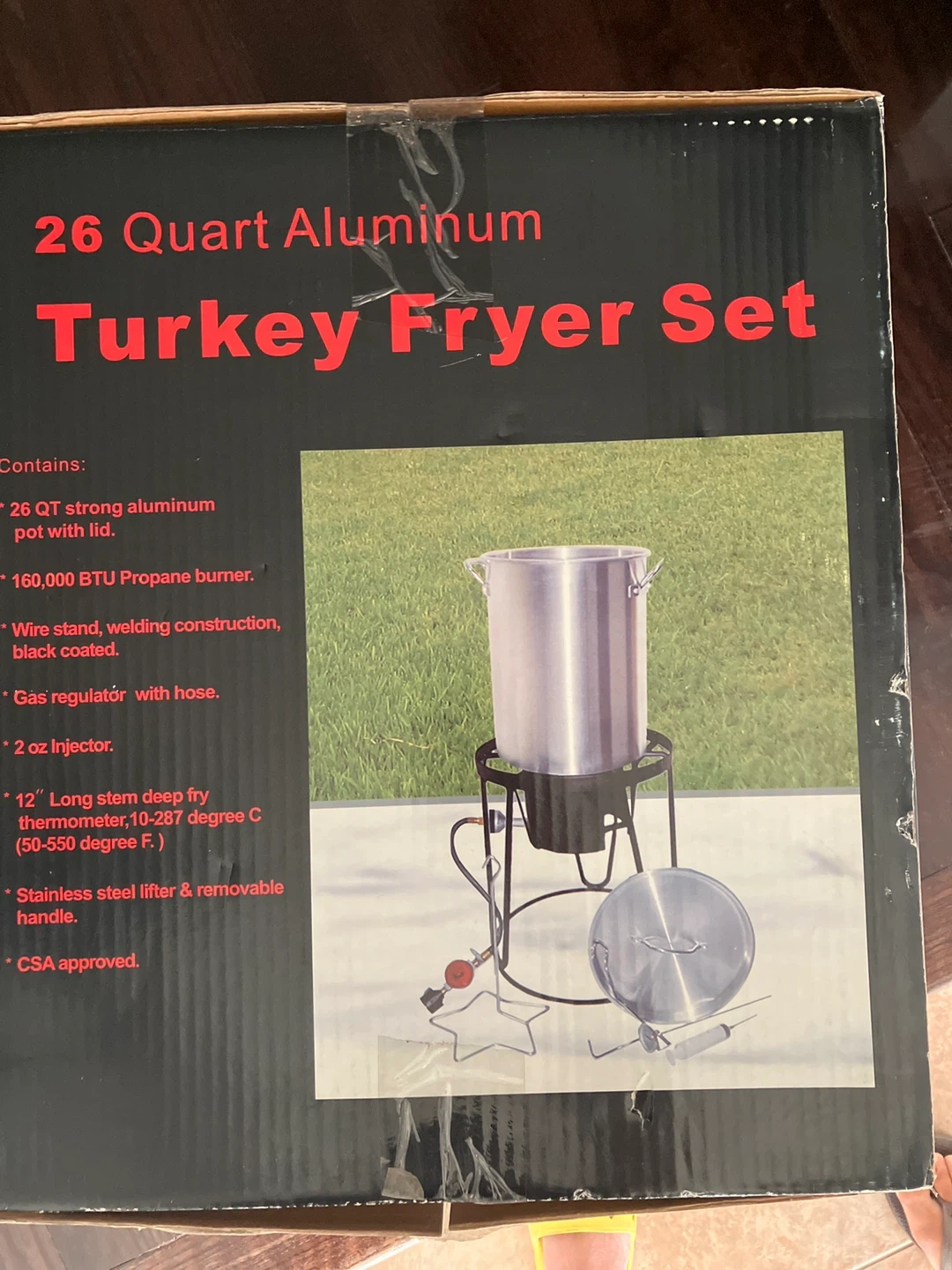 Selling a brand new, never used 26 Quart Aluminum Turkey Fryer Set! It comes complete in its original box and includes all components. - 26 QT strong aluminum pot with lid - 160,000 BTU Propane burner - Wire stand, welding construction, black coated - Gas regulator with hose - 2 oz injector - 12" Long stem deep fry thermometer, 10-287 degree C (50-550 degree F) - Stainless steel lifter & removable handle - CSA approved