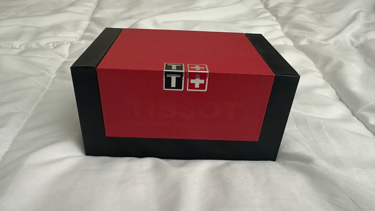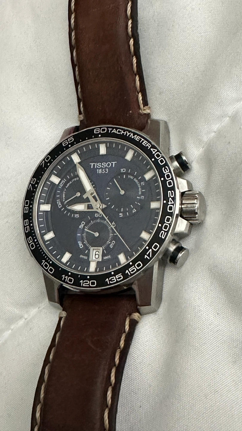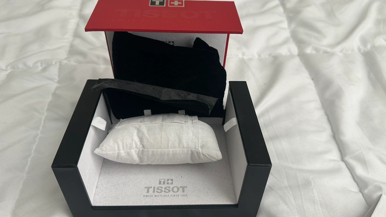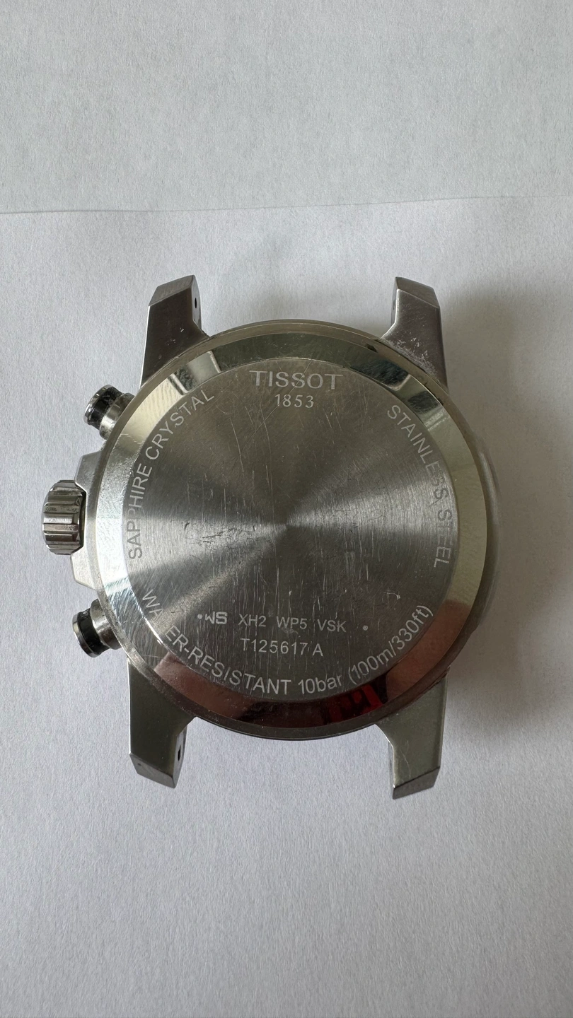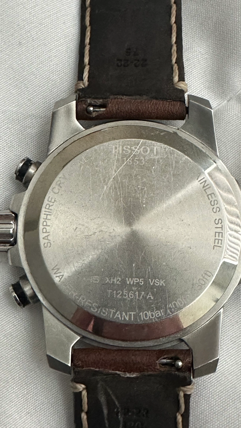 Tissot 1853 works perfect. No scratches or dents on the face no cracks. Few scratches on the back of the watch as pics show. Comes with box velvet bag and books.