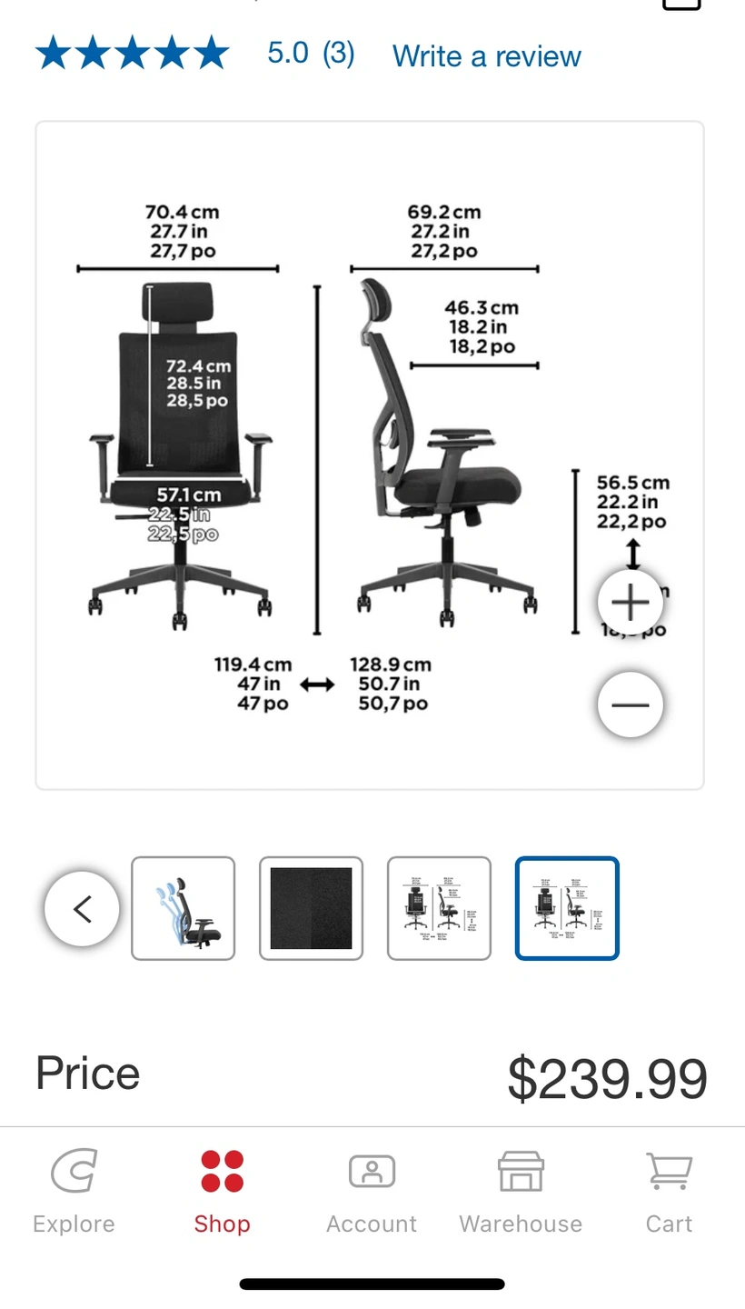 263La-Z-Boy Executive Mesh Office Chair with Adjustable Headrest from Costco Originally purchased for 240$, used for 4 months only Padded headrest adds extra cushioning and can be adjusted to different heights Breathable mesh back provides air circulation to help keep you cool and ventilated Premium seat plate with 3 locking positions Height adjustable padded armrests Adjustable lift mechanism lets you customize seat height for optimal support Sculpted foam seat cushion retains its shape Endorsed by the American Chiropractic Association Greenguard certified Supports up to 124.74 kg (275 lb.) · 70.36 cm x 69.09 cm x 119.38 – 128.91 cm (27.7 in. x 27.2 in. x 47 - 50.75 in.) Seat height: 46.99 cm – 55.88 cm (18.5 in. - 22 in.) Seat depth: 46.23 cm (18.2 in.) Weight: 17.1 kg (37.69 lb.) https://www.costco.ca/la-z-boy-executive-mesh-office-chair-with-adjustable-headrest.product.4000187200.html?province=ON&langId=-24&COSTID=iosapp_deeplink_24.7.1&TRACKING=NO&sh=true&nf=true