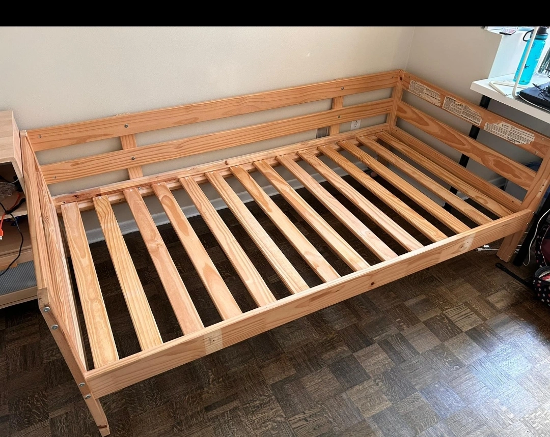 This is a wooden bed frame that would be suitable for a single bed. It is in good condition. Pick up near Don Mills/ Sheppard. Delivery and assembly are available for extra charge.