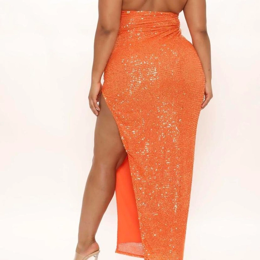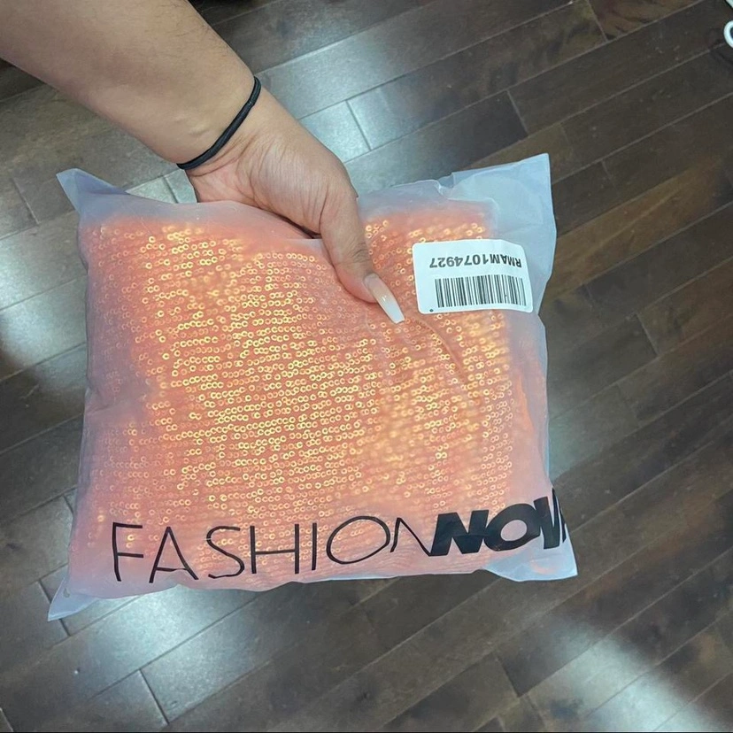 Tag says large but fits like a medium. Not very stretchy. Lined and backless, with a stretchy neck. X-front halter neckline that has that keyhole effect. From Fashion Nova still in packaging. Orange sequined dress. Very pretty, great for prom, some sort of formal event, weddings, etc. Bought for a vacation that got cancelled so don’t need it. fits like a 6