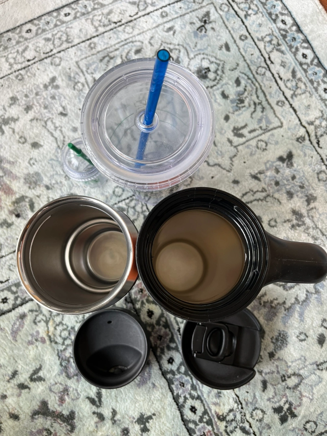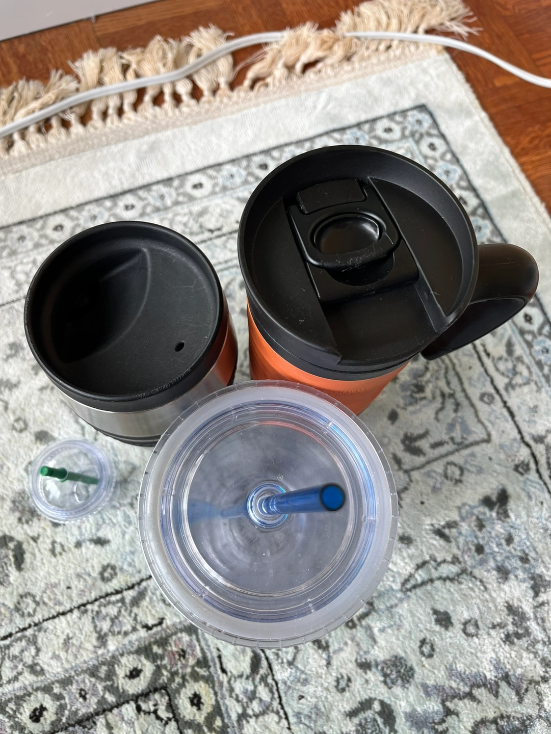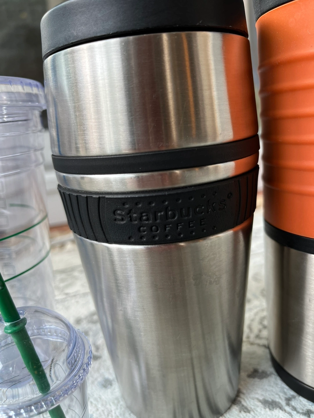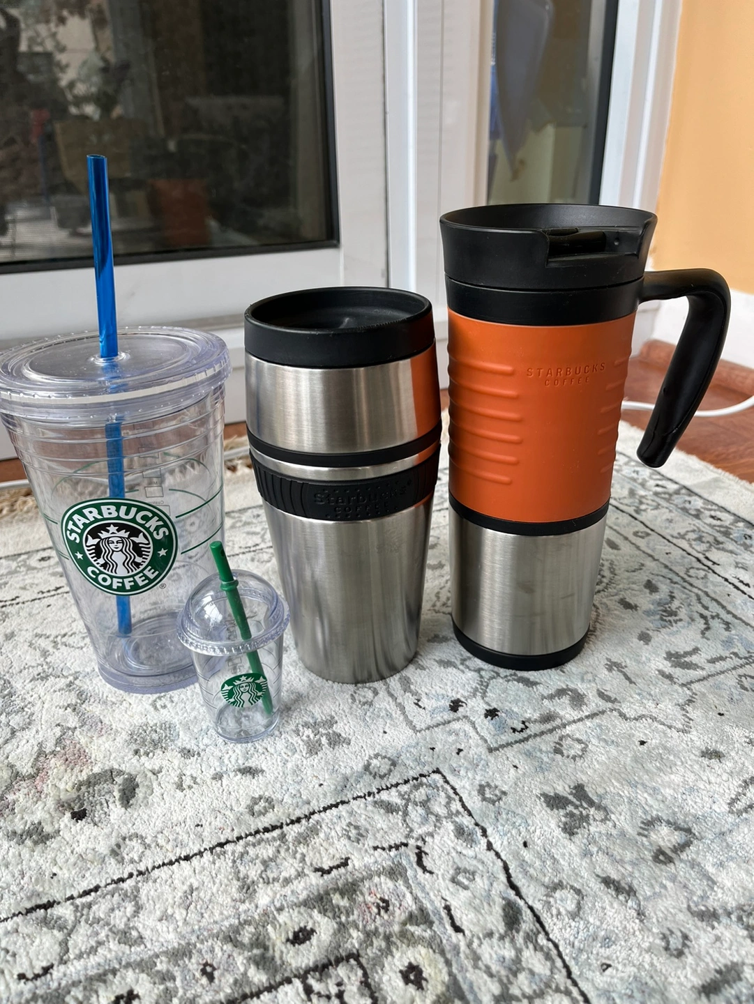 Selling a set of 3 reusable drink containers. Two are stainless steel insulated coffee/tea travel mugs. The orange one is fully spill proof. The other all stainless steel tumbler is not. The third is a double thick plastic reusable drink cup with straw for cold drinks. Note, we lost the original green straw, so replaced with a blue plastic straw. All in very good condition as they were lightly used. Including a cute small tree ornament as well. Cash and pick up only downtown. Bloor & Ted Rogers Way (Jarvis).