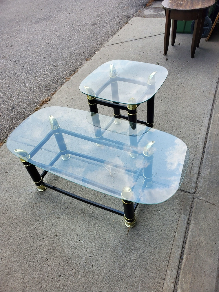 This is a set of two glass coffee tables, one large oval-shaped table and one smaller square table. They both have black metal bases with gold accents. The tables are in good condition and ready to add a touch of elegance to your home.