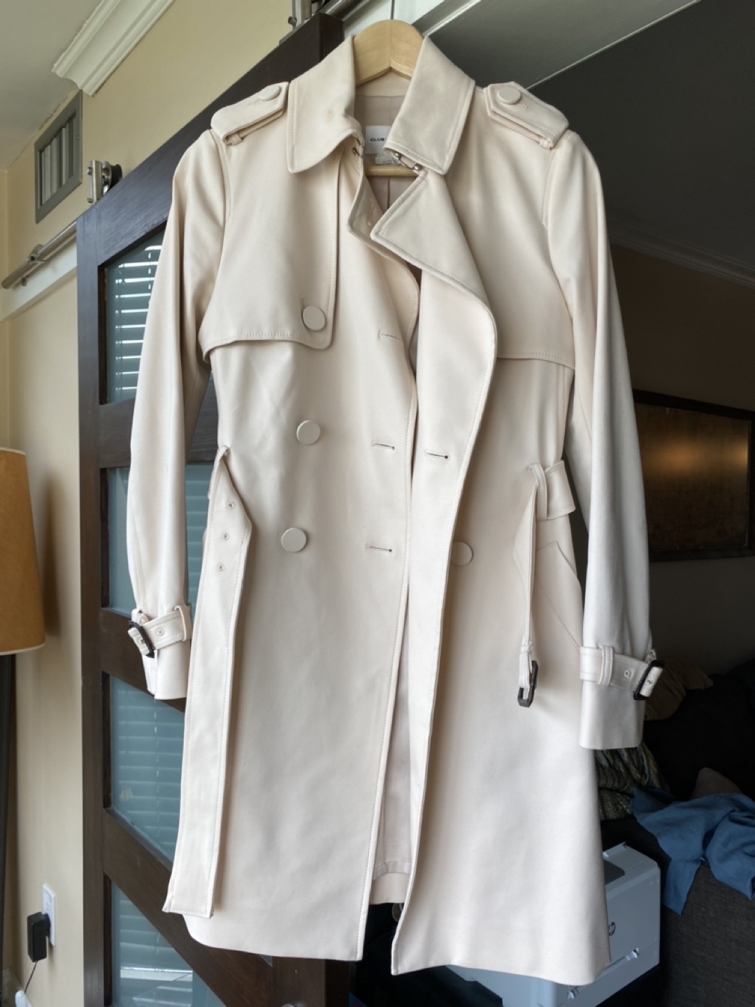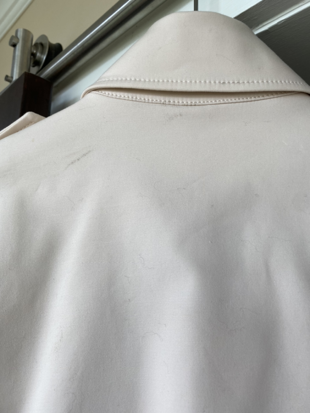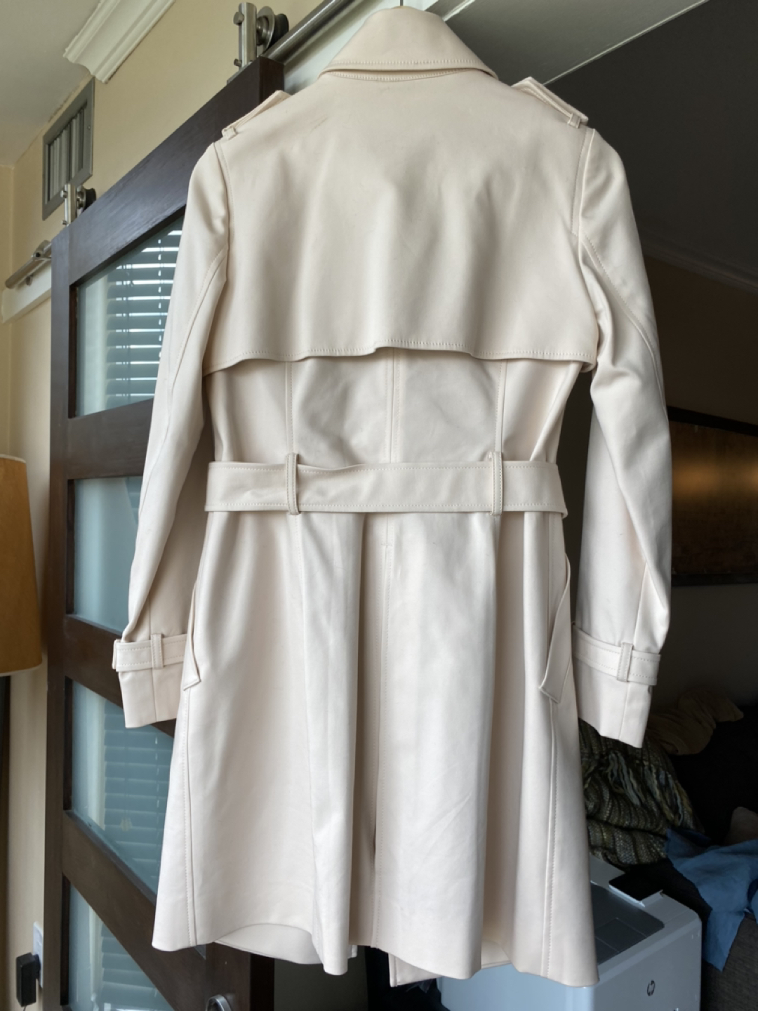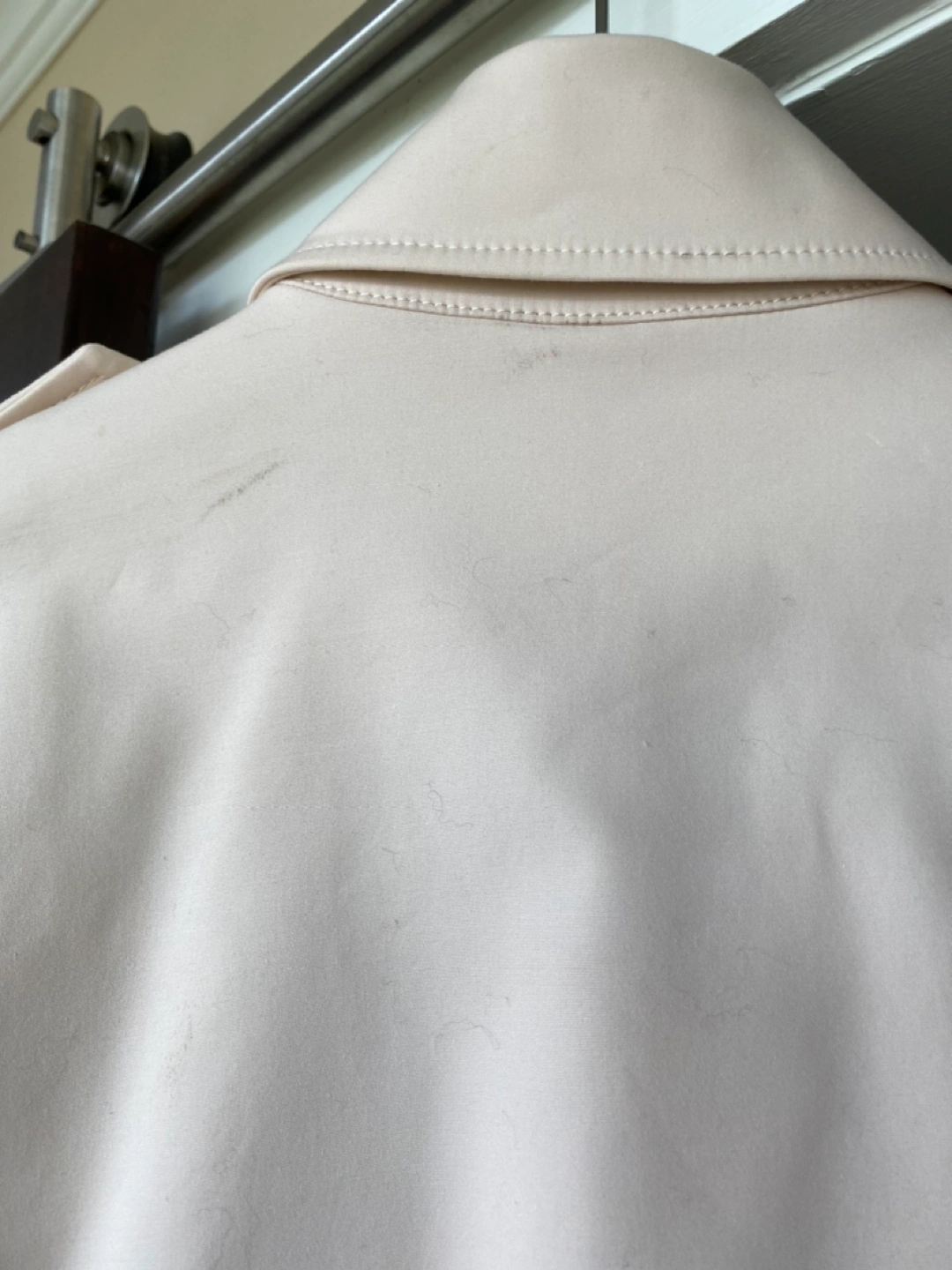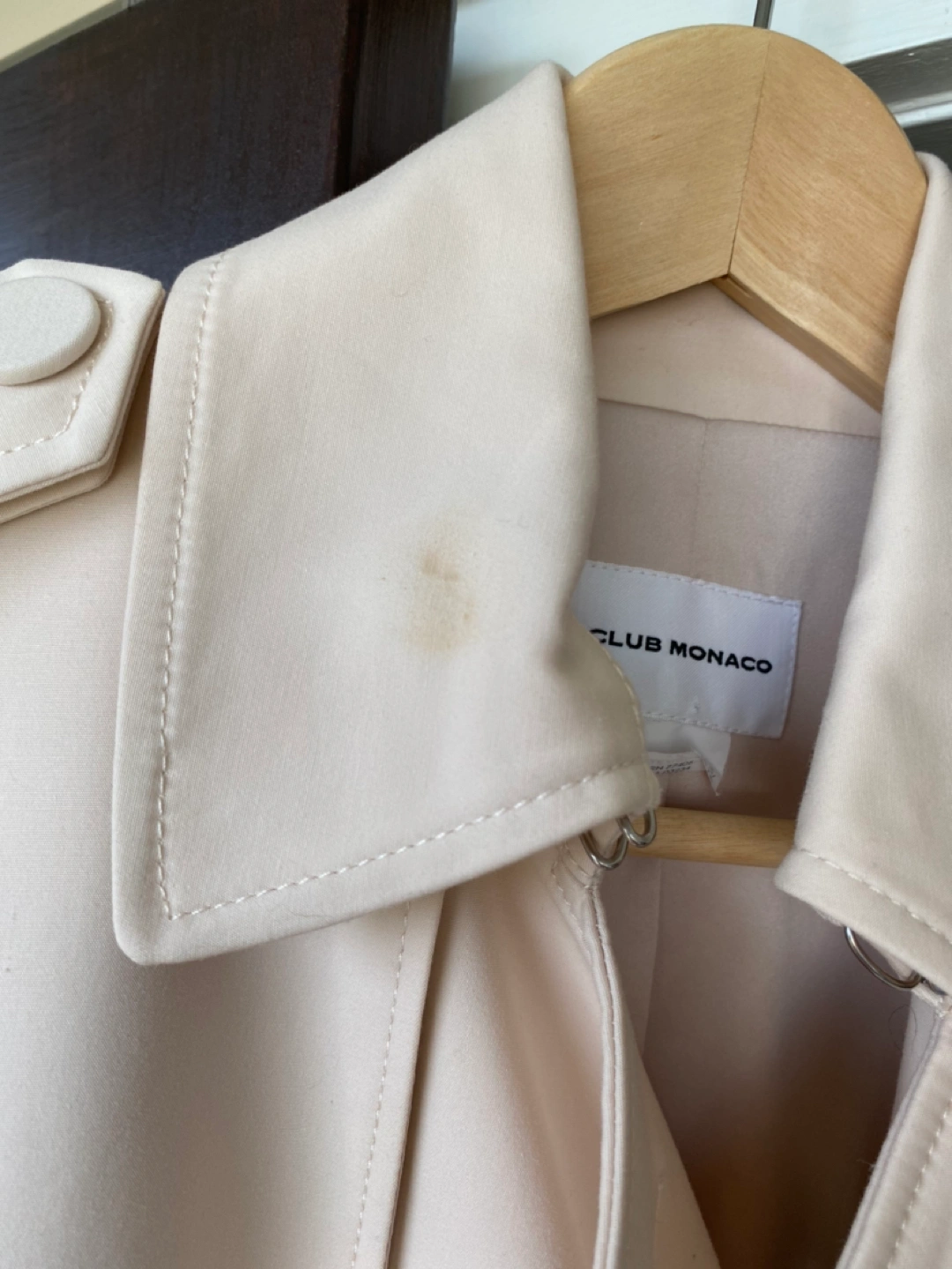 I’ve only worn this coat a couple of times. There are some marks (please refer to photos), but I’ve never tried to properly remove them. It could be dry cleaned. It’s a true light pink colour in person.