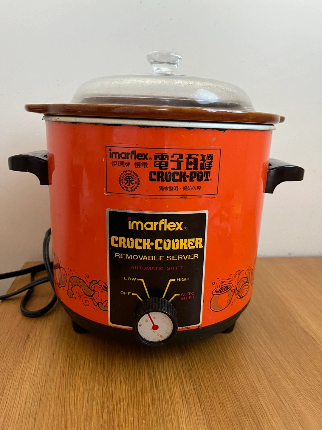 This slow cooker has a removable ceramic server, a glass lid and an automatic shift feature. Perfect working condition. Made in Japan.