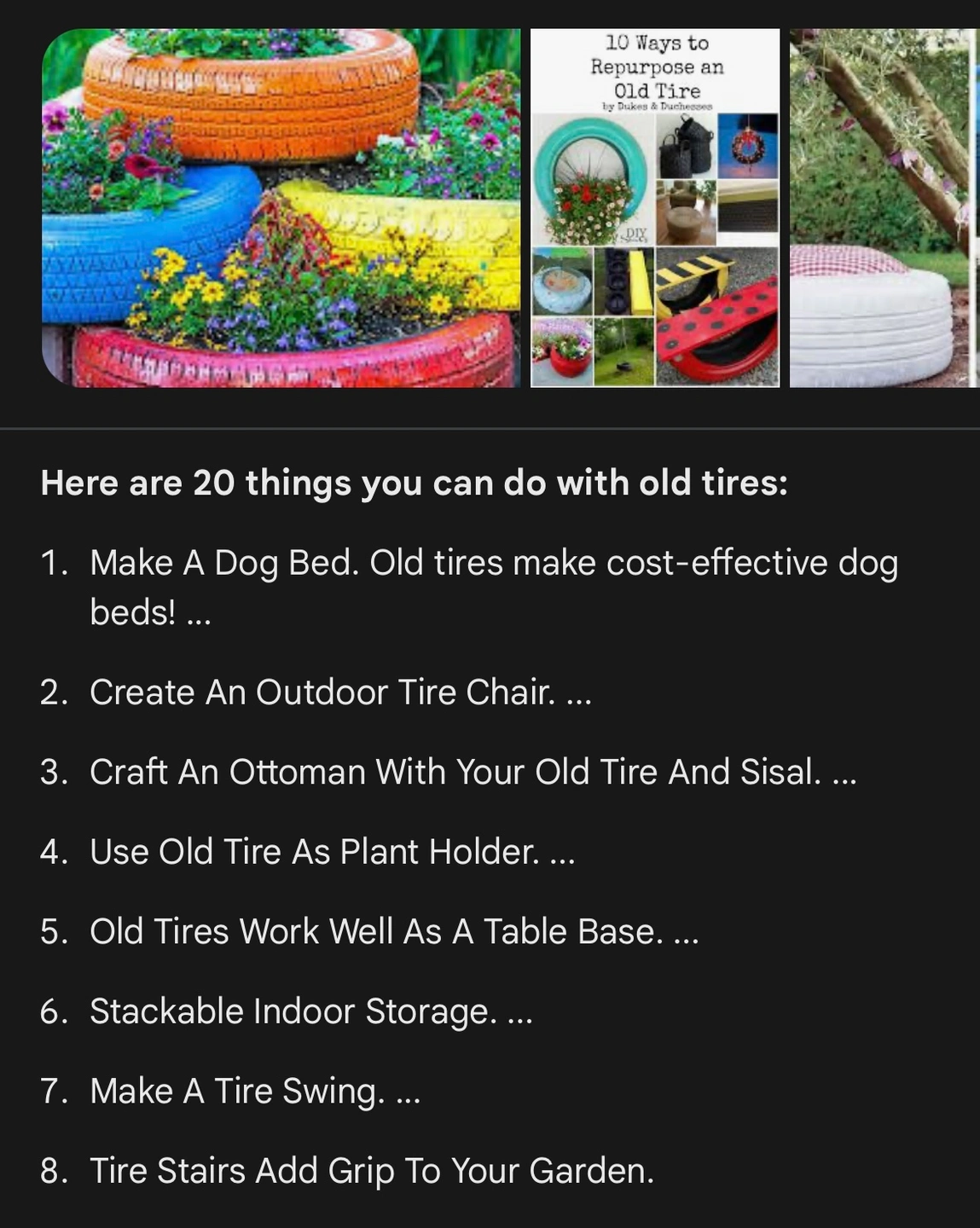2 free used car tires. Not road safe but good for repurposing. Must pick up on Dufferin between College & Dundas. Prefer them gone this week. Can take one or both.
