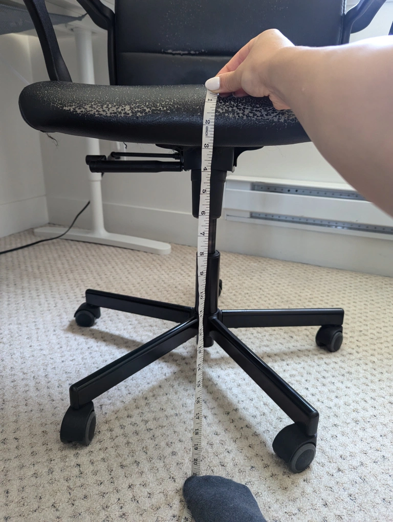 Well loved office chair! The leather on the seat is peeling somewhat but it works fine. Seat is 21 inches at maximum height (floor to seat). It does have trouble staying at the max height but the chair dips maybe an inch when you sit down.
