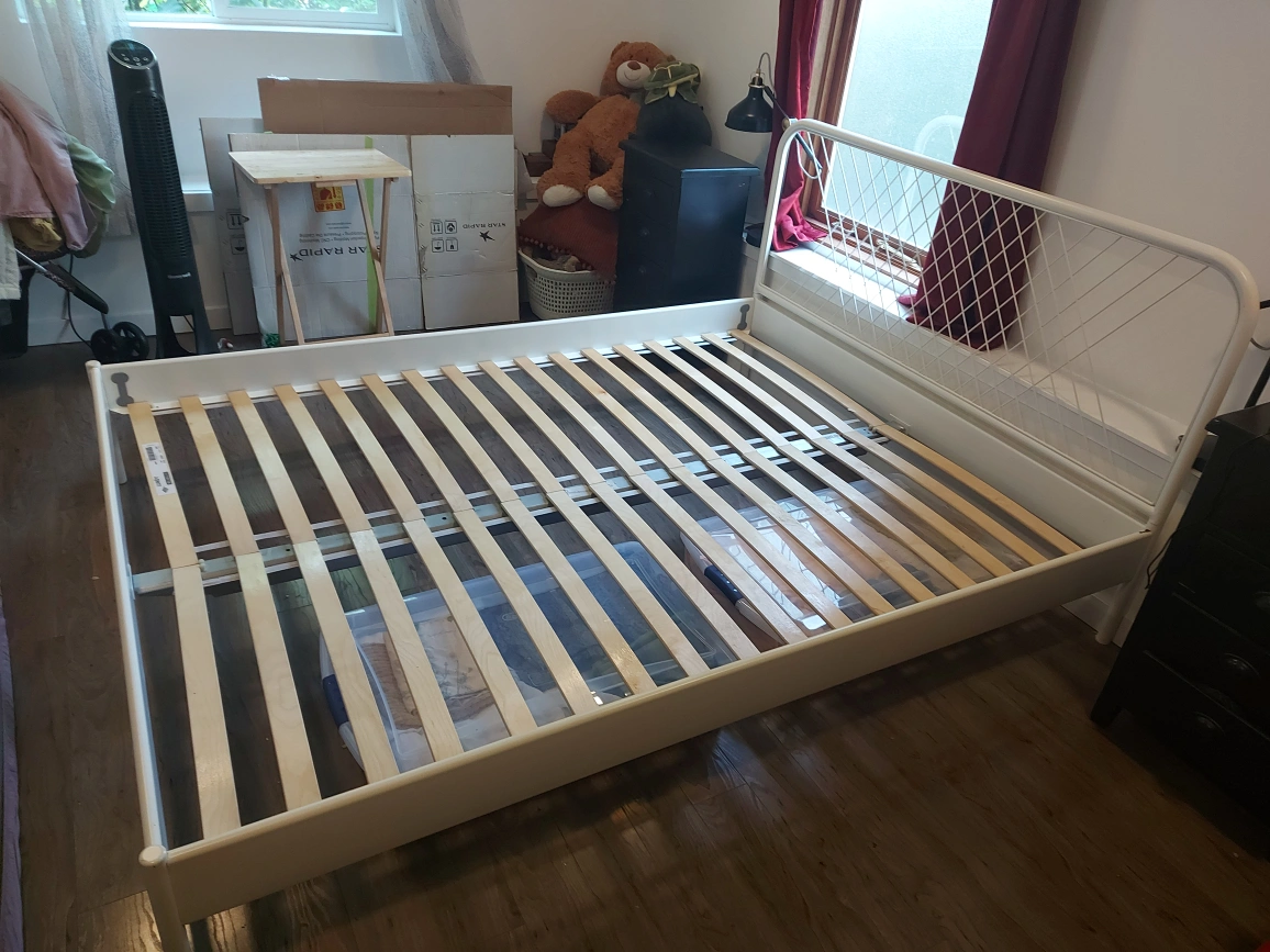 White metal bed frame with slatted base. Queen size. It's in great condition, I'm just getting a bigger bed so need to replace. π