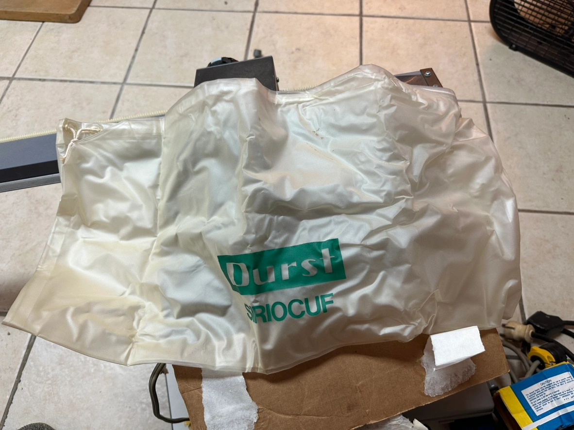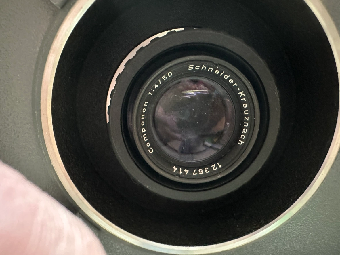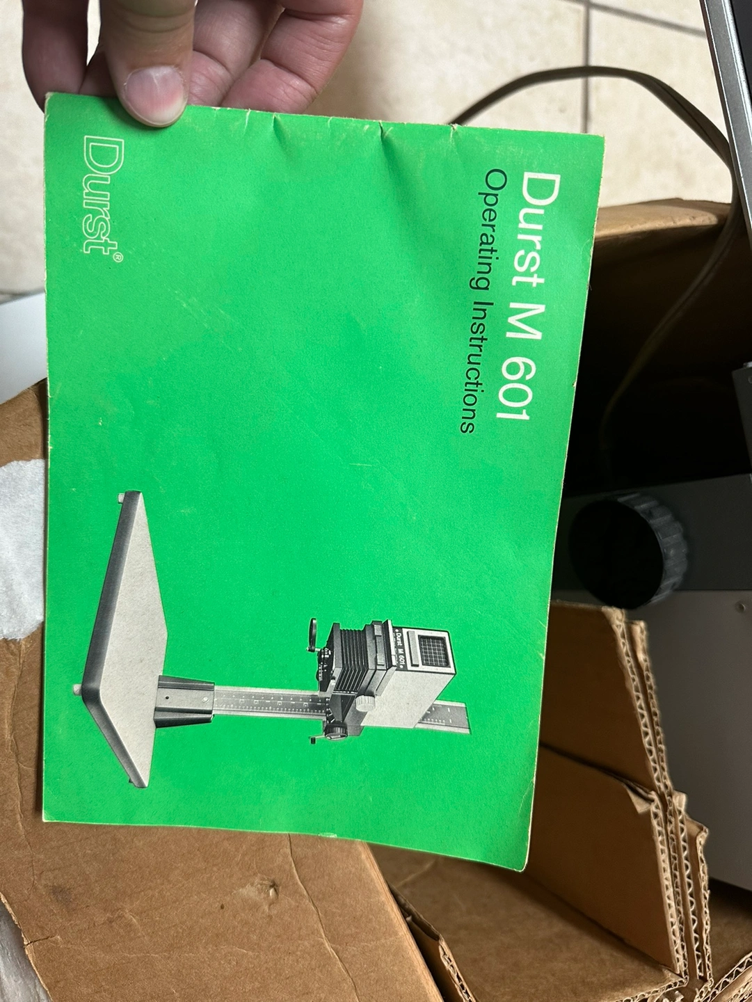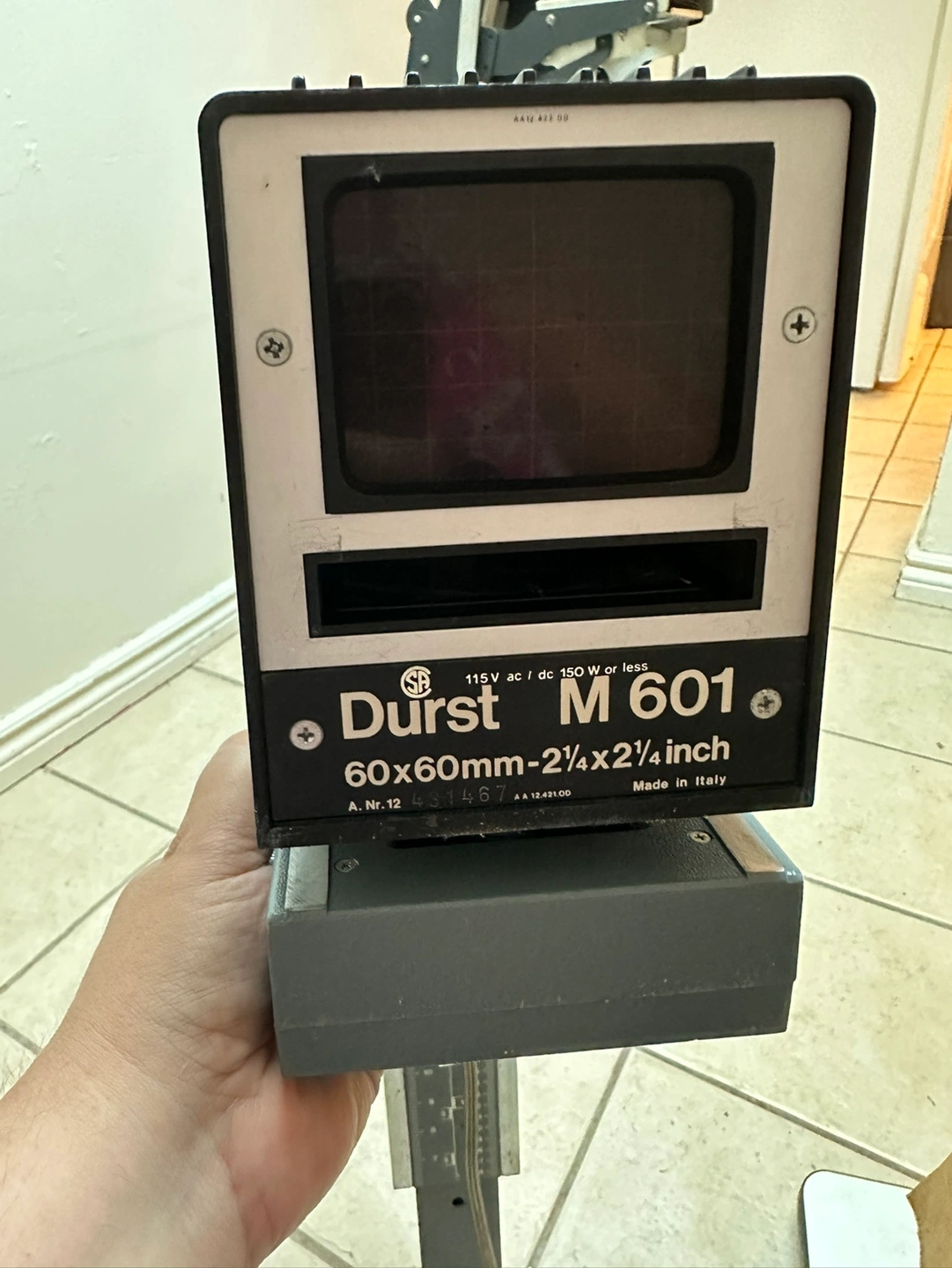 FREE: Durst 2 1/4 x 2 1/4” enlarger. Includes base, stand, Leitz timer, Schneider-Kreuznach componon 1:4 /50 lens (with original box & lens cap) & mount, 19 Cibachrome 3 1/2 x 3 1/2 colour printing filters, extra filters, anti newton ring glass, filter holder, 35 mm neg holder with masking, operating manual, 4 extra bulbs in original boxes, extra 6x6 condenser, cords, and original dust cover.