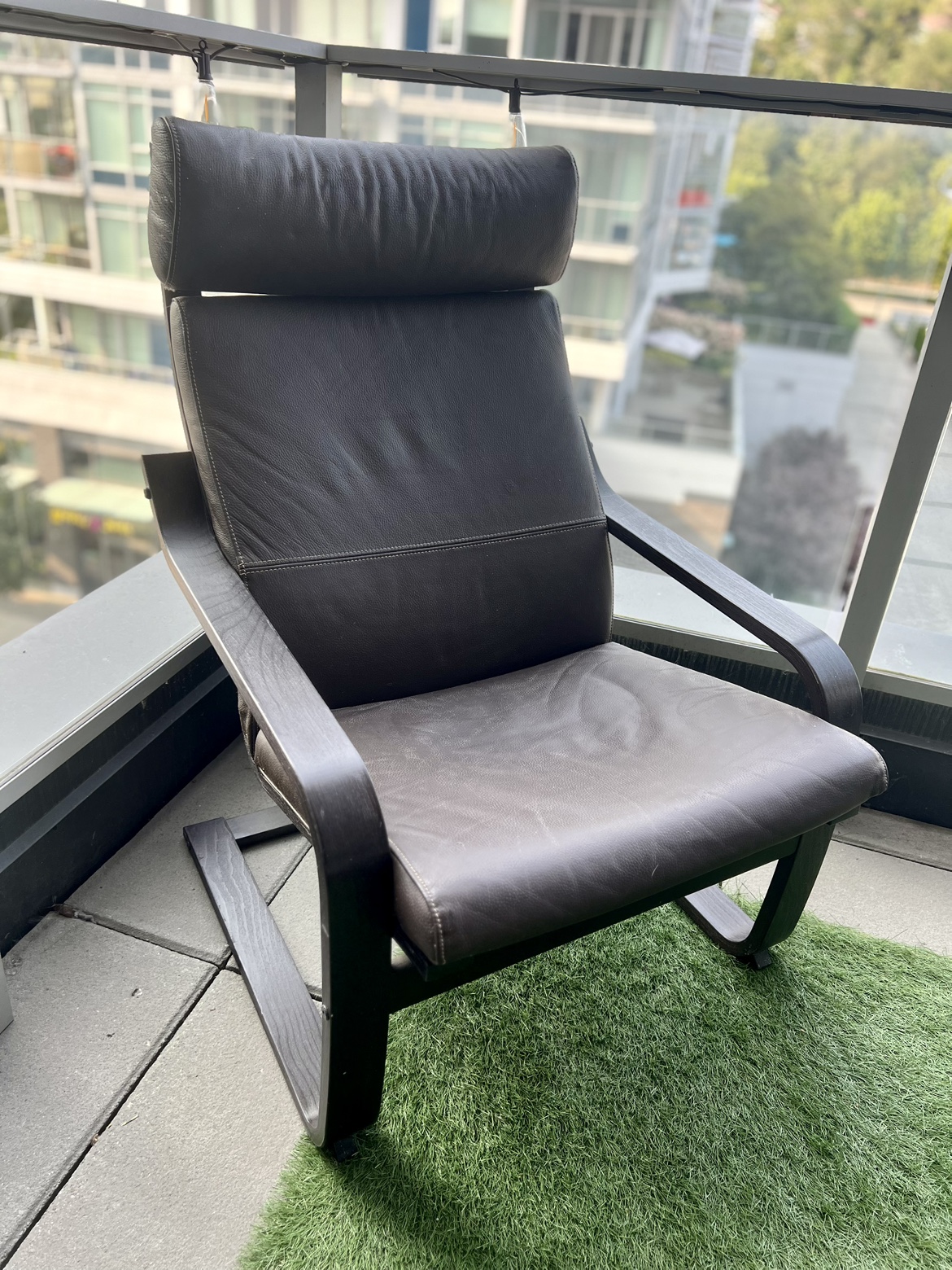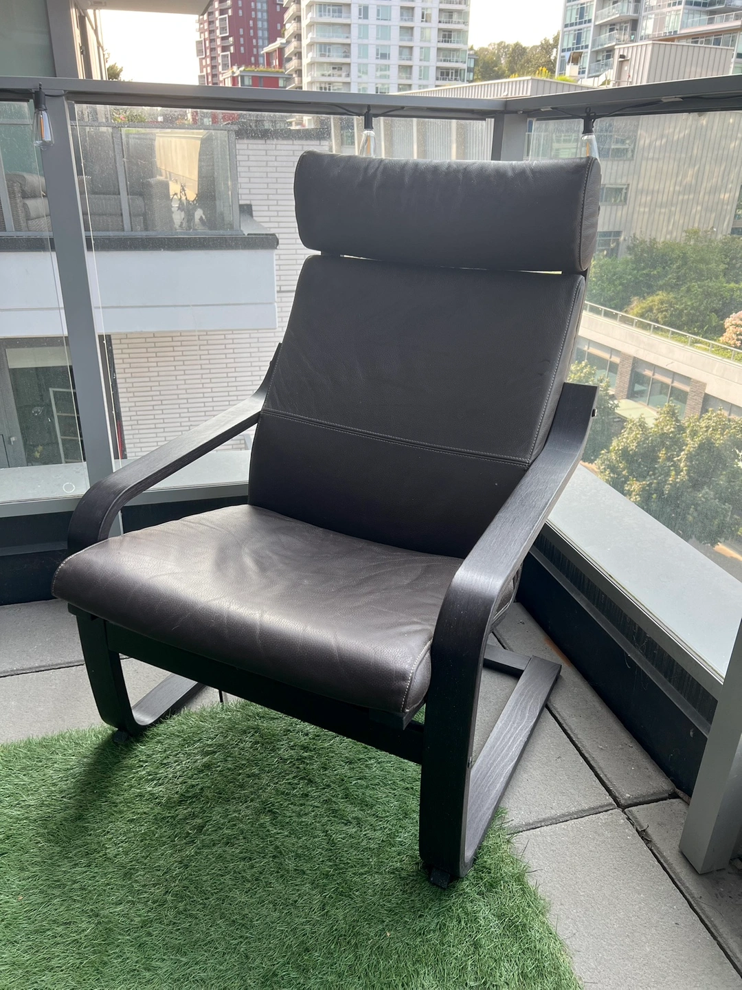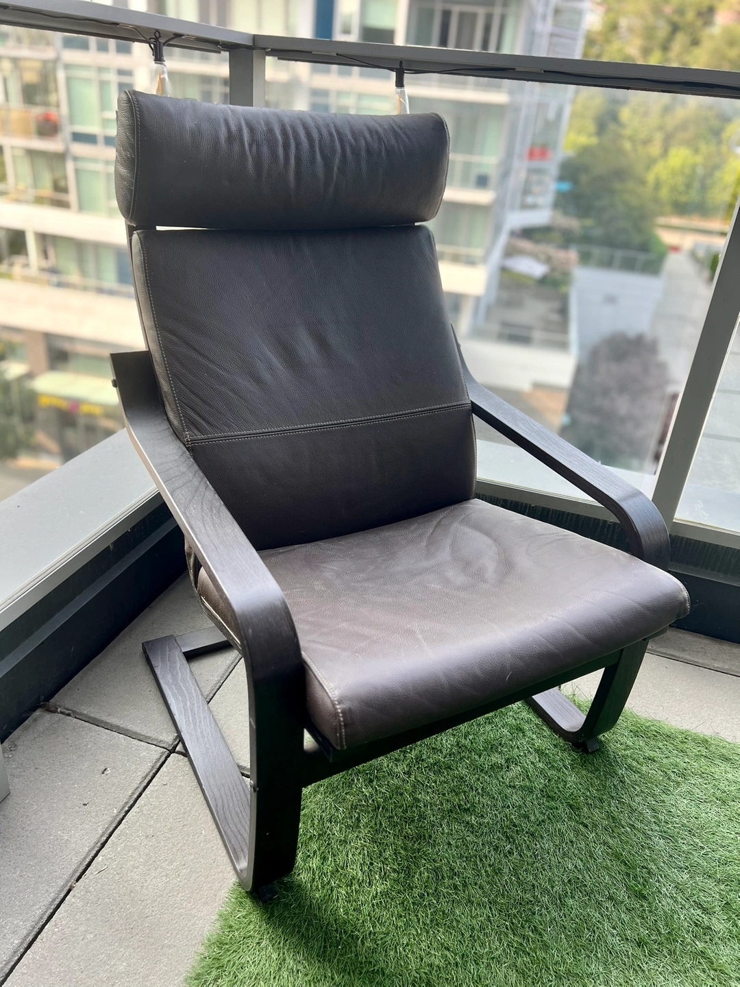 75Ikea POÄNG Leather Arm Chair. Owned for 5 years in pet-free home. Quality is good, just a bit dusty from sitting outside for a month. Unfortunately I have no space for it, otherwise I would love to keep it as it’s comfortable, sturdy, and the leather is easy to clean.