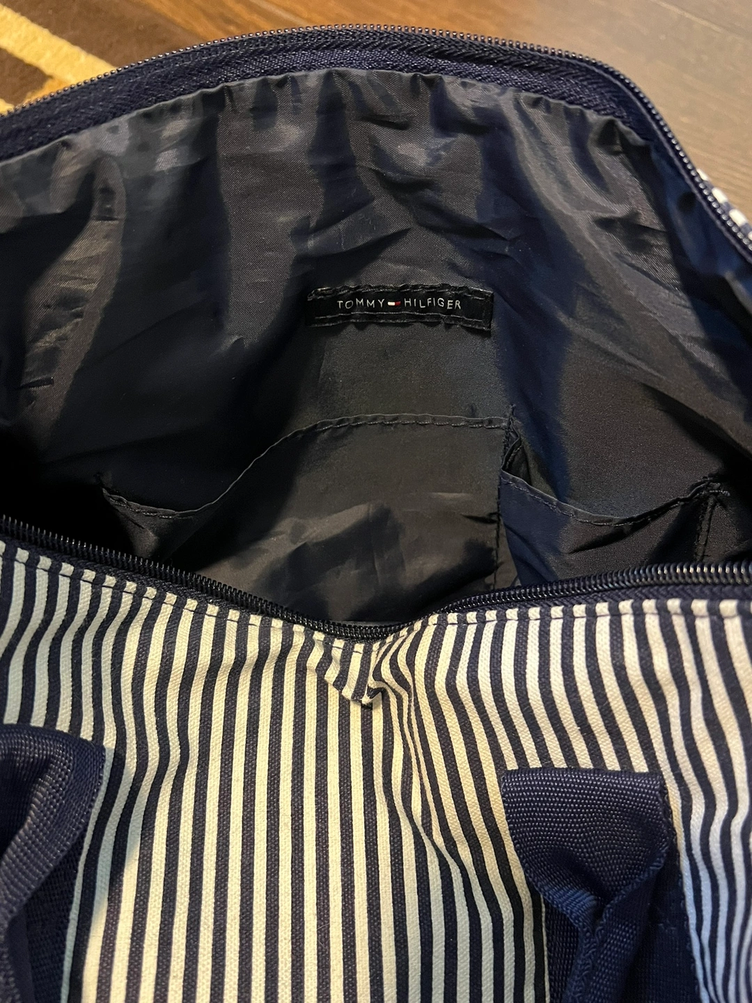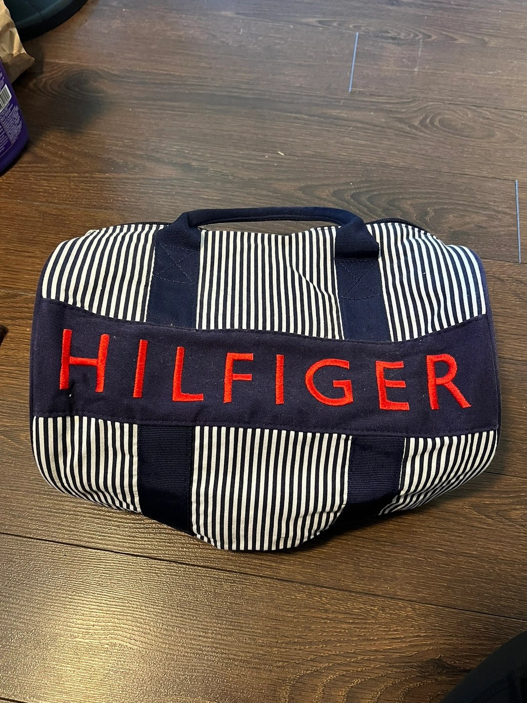 Vintage stripped mini Tommy Hilfiger duffel bag. Clean interior, two pockets on the inside. Great as a small gym bag!