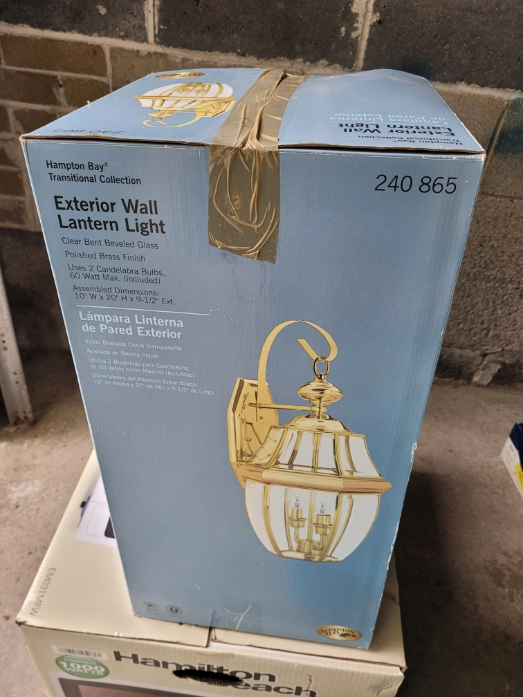This is a Hampton Bay Transitional Collection Exterior Wall Lantern Light in a polished brass finish. It comes with clear bent bevelled glass and uses 2 candelabra bulbs, 60 Watt Max (included). The assembled dimensions are 10" W x 20" H x 9 1/2" Ext.