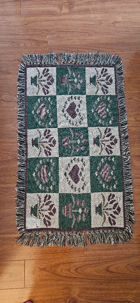 small, roughly 2ft by 3ft rug. adorable little addition to your den or family room. decluttering so getting rid of this well-loved piece!