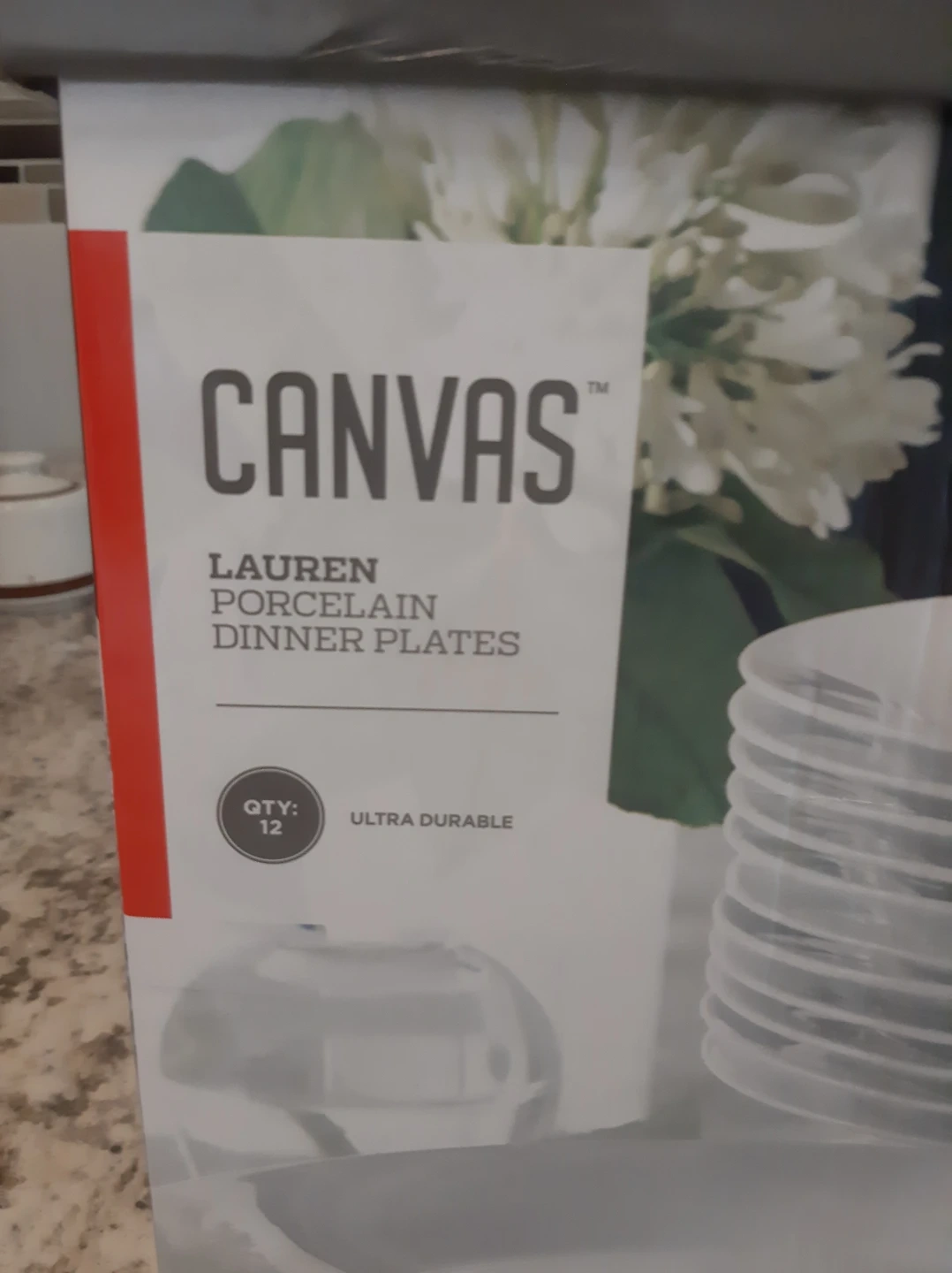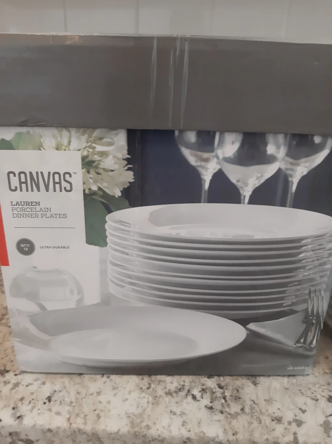 2 12 Piece Plate sets 6 big plates & 6 small plates both sets are different! The set in the box are just plain white plates, The set in the bag have a ring design around the plates.