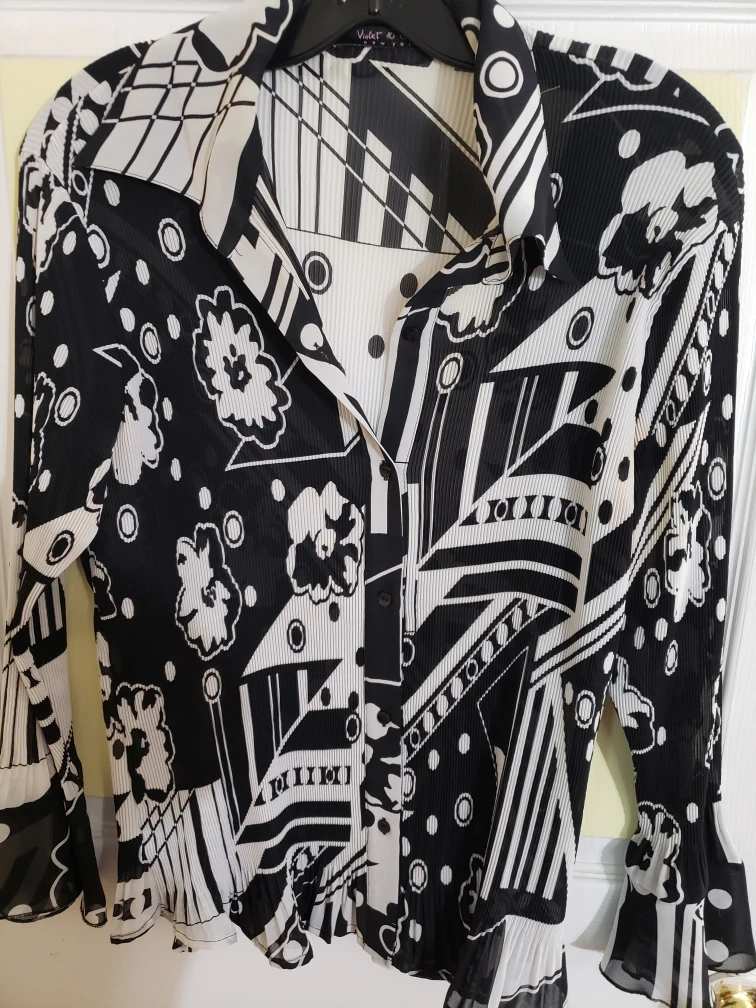 132Black and white abstract print button up blouse with 3/4 sleeves.