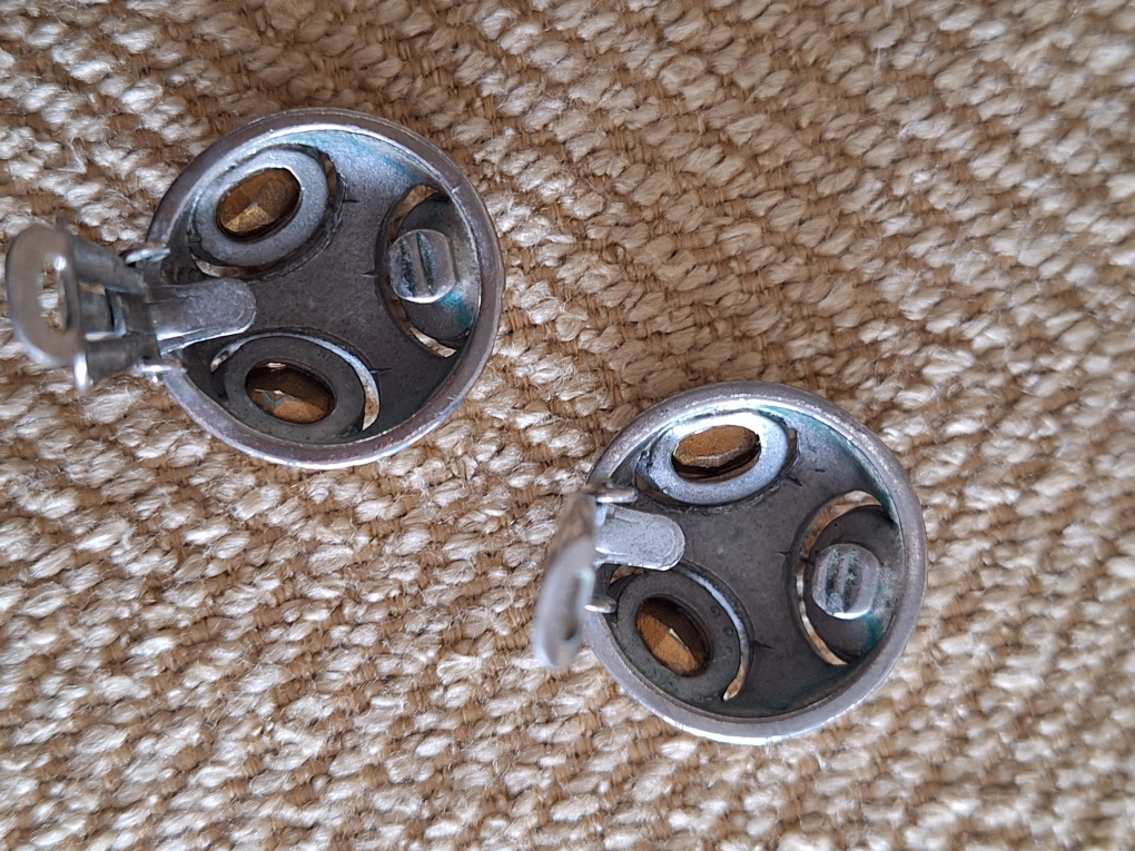 These earrings feature a round, textured design with rhinestones. They are clip on earrings. They are in very good conditions.
