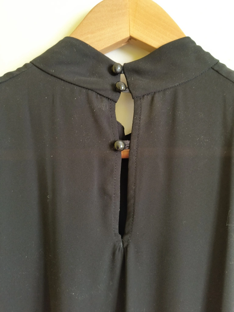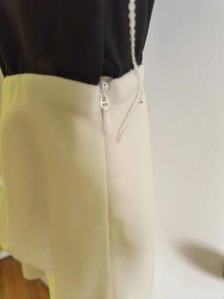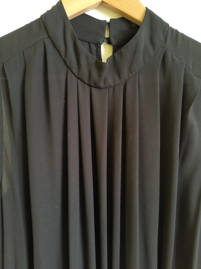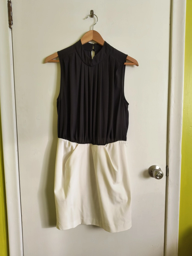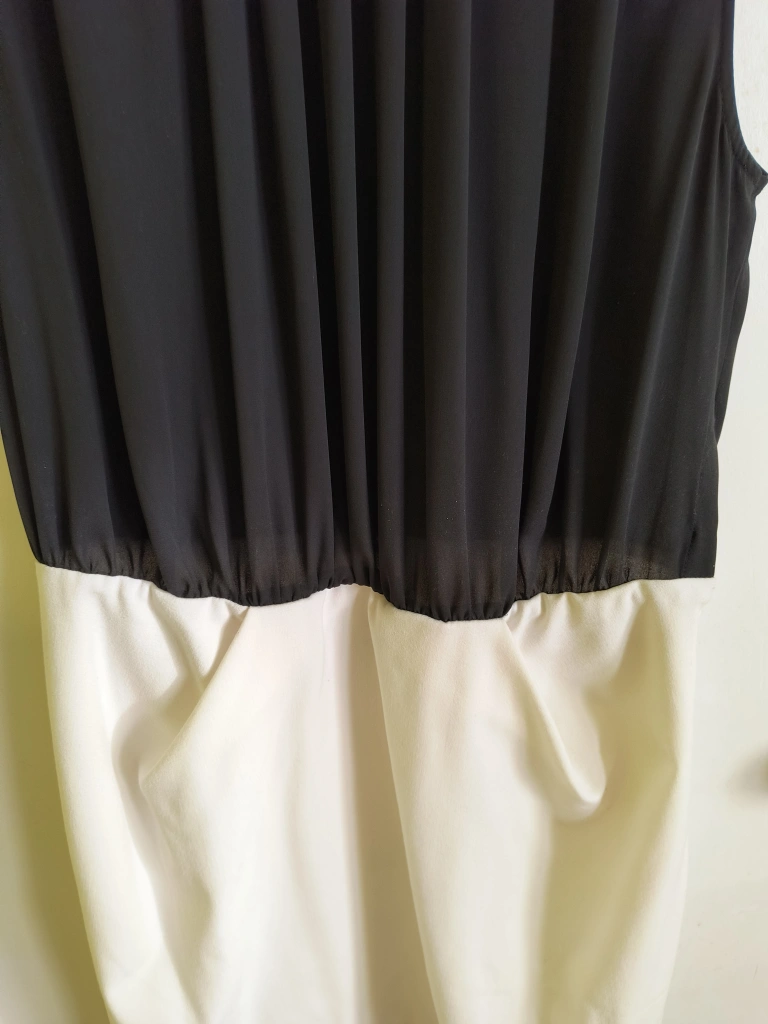 A sleeveless black and white dress. The top half of the dress is a black, pleated fabric. The bottom half of the dress is a white, solid fabric. The dress has a high neckline. The dress is in good condition.