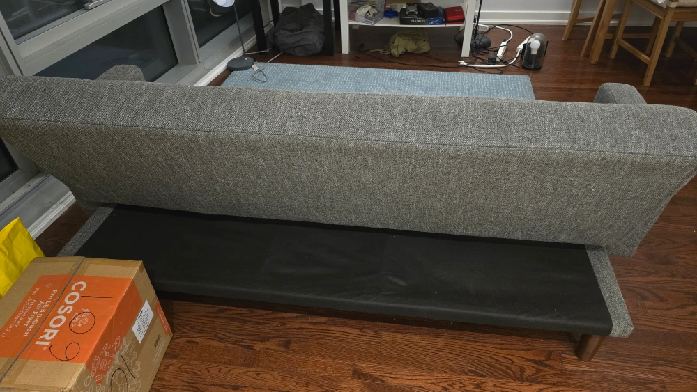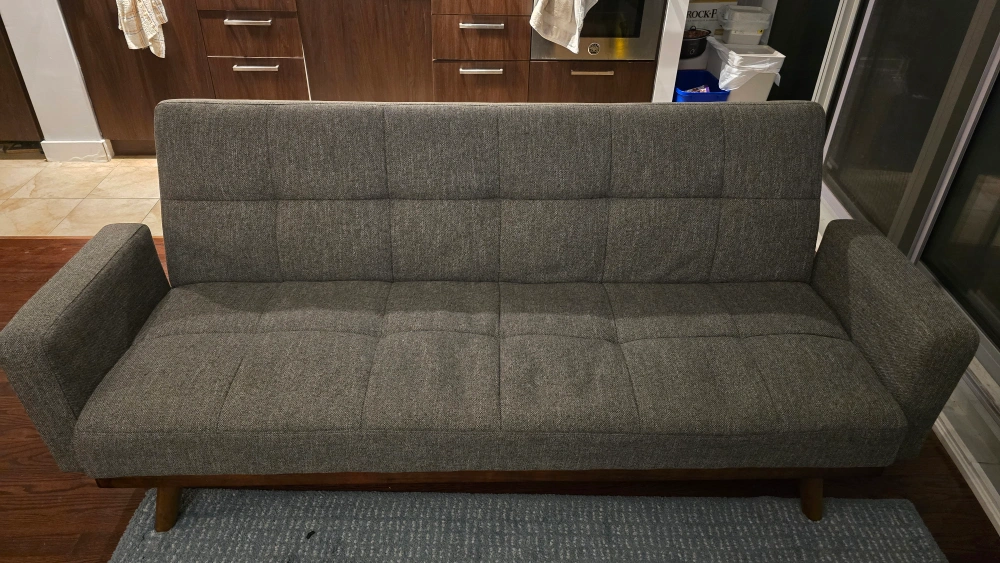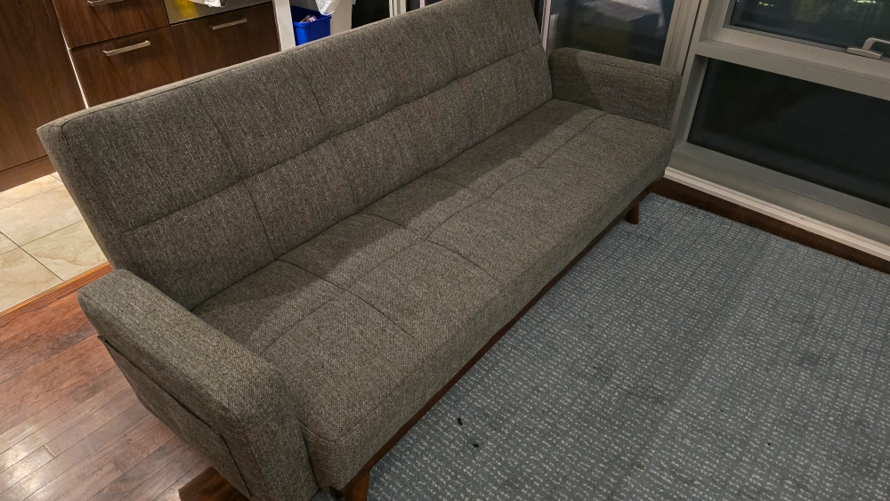 This couch is barely used and in great condition. It folds out into a bed as well. It has wooden legs and a grey fabric covering. It's perfect for a small space!