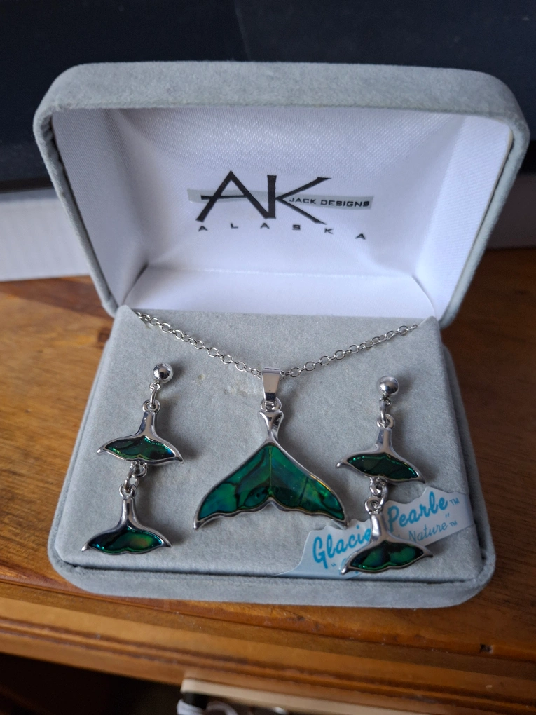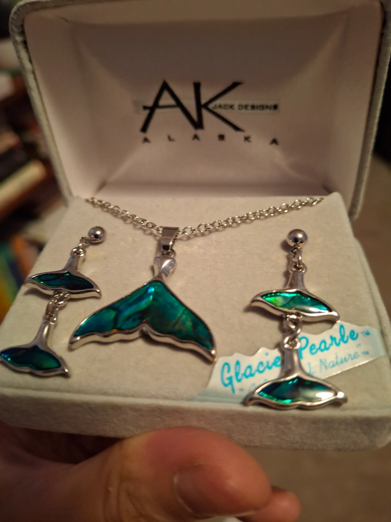 Silver necklace and earrings set with an abalone shell mermaid tail design. Never worn & in the original box.