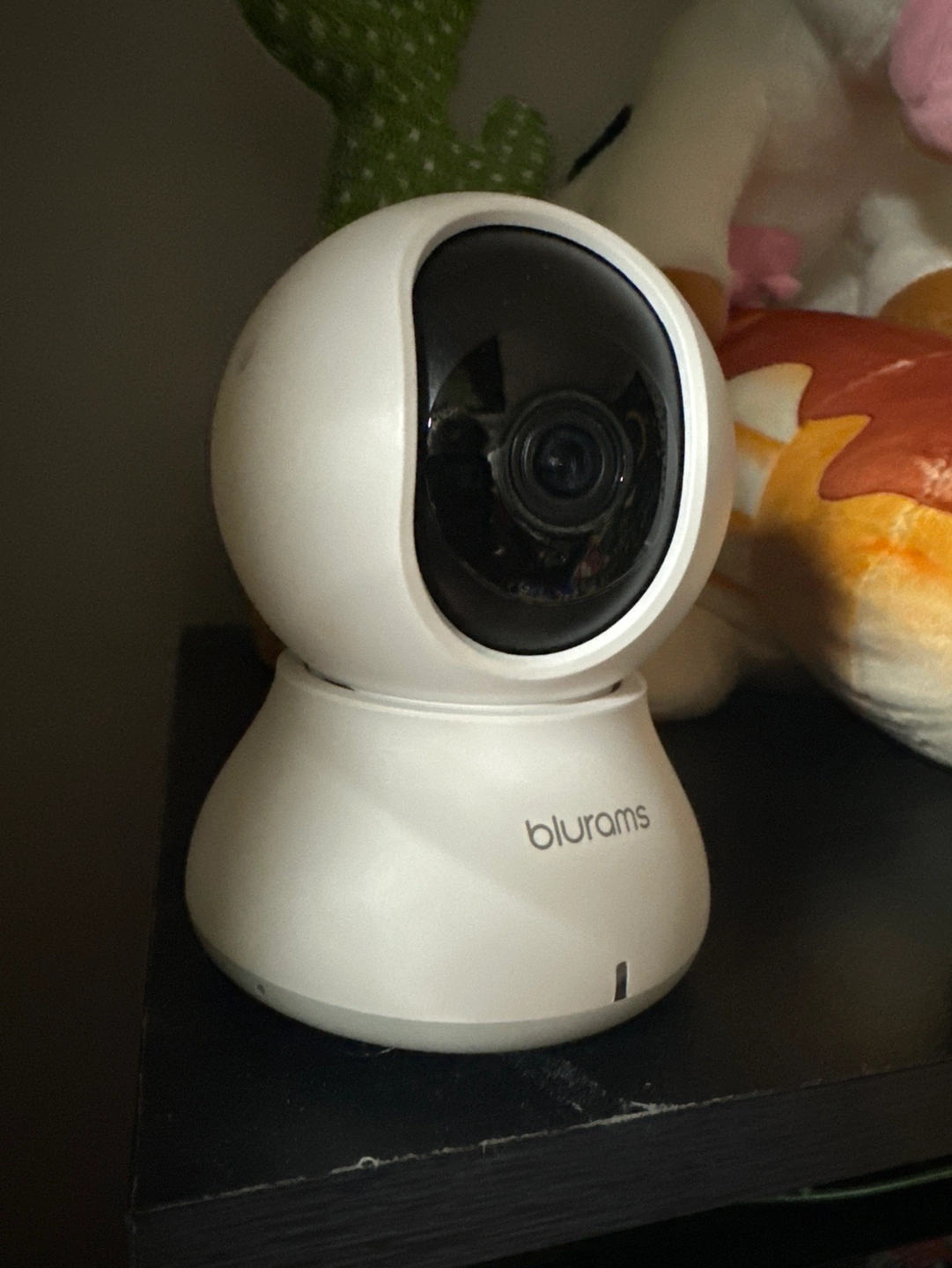White security camera with a wide-angle lens. It has a brand name "Blurams" on the base. It can be used for home security. It is small and compact and can be placed on a shelf or table.