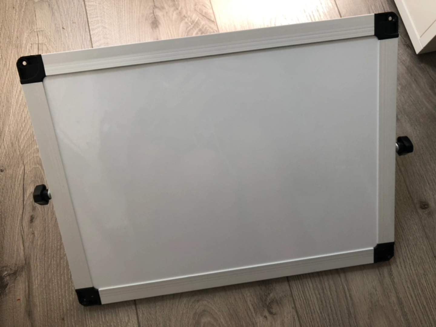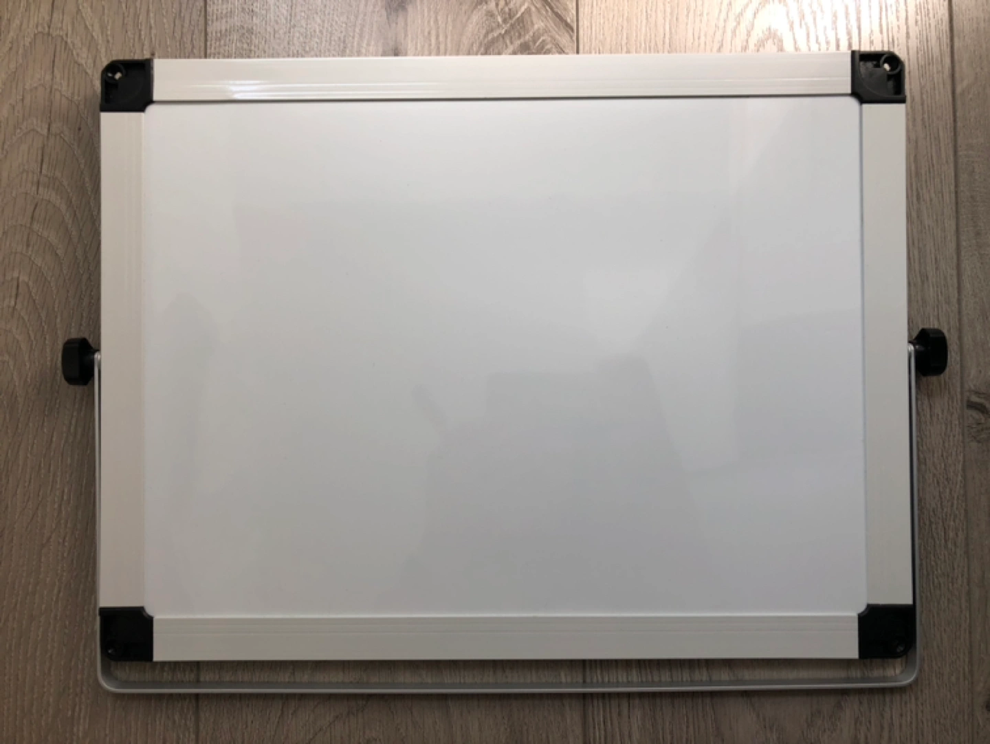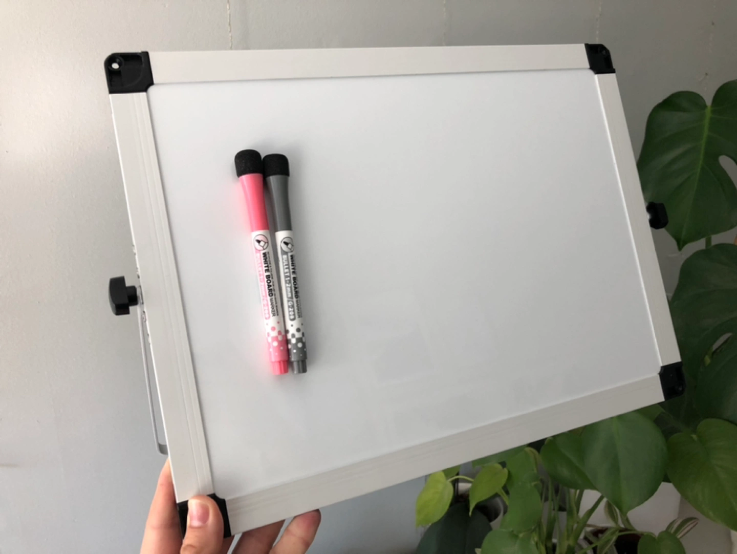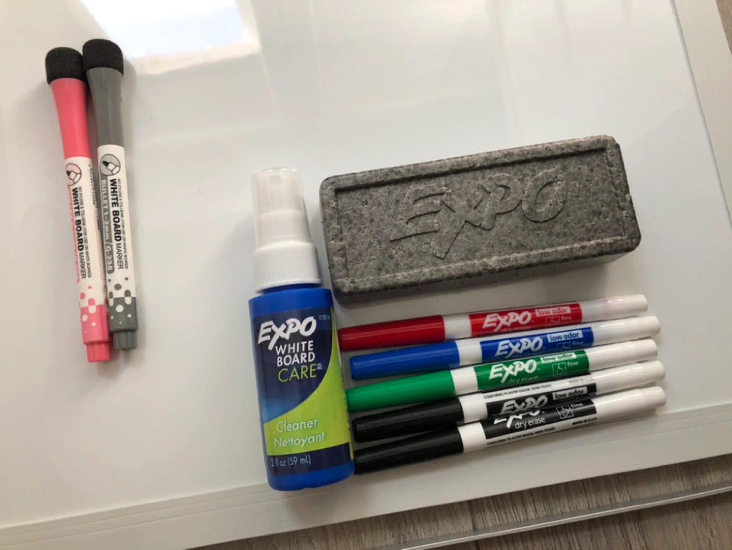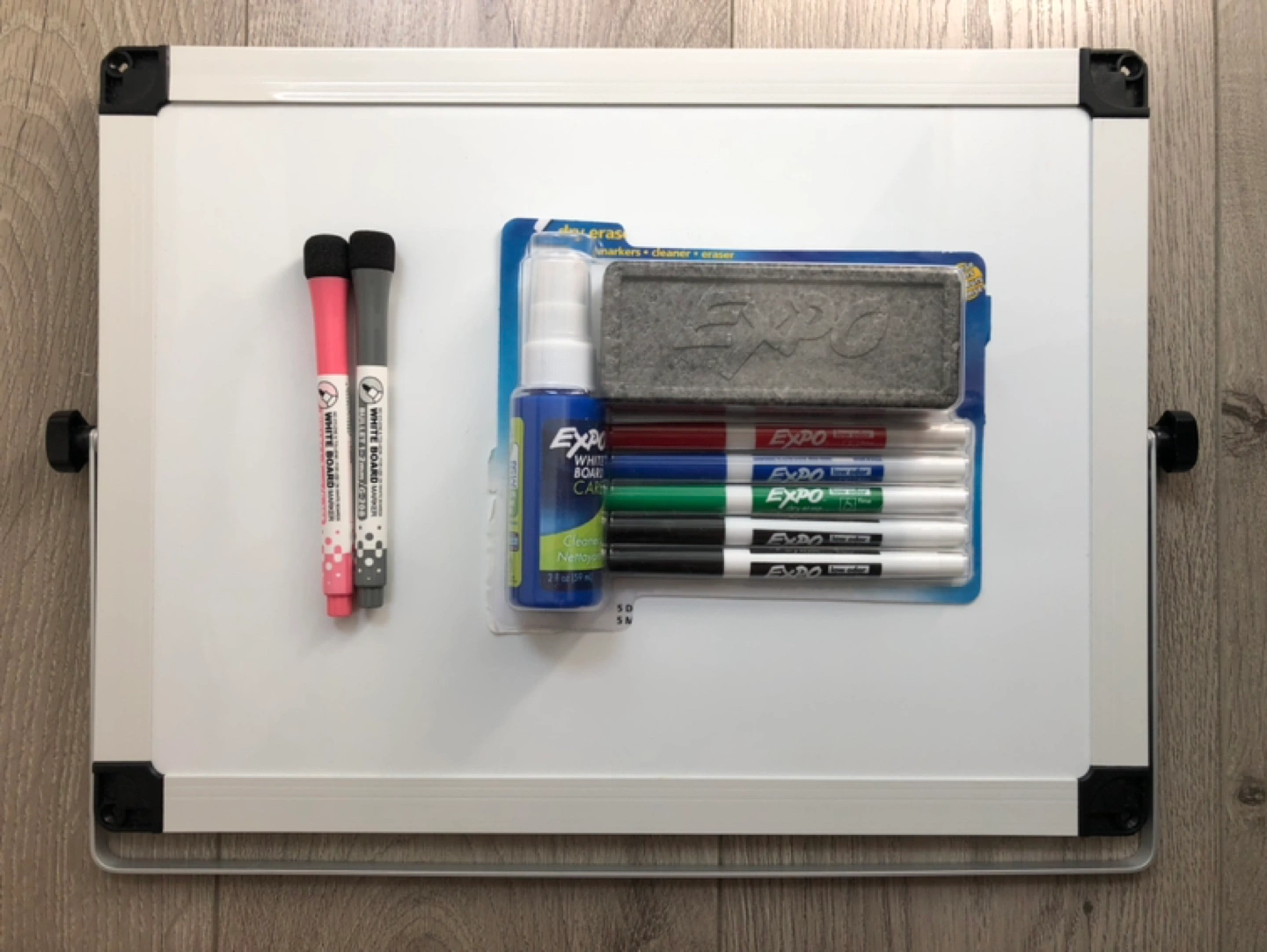 Brand new personal whiteboard (16”x12”). Double-sided with tilt-able easel stand. Together with 2 magnetic fine tip markers + Expo 7-piece fine tip marker, eraser and whiteboard cleaner set.