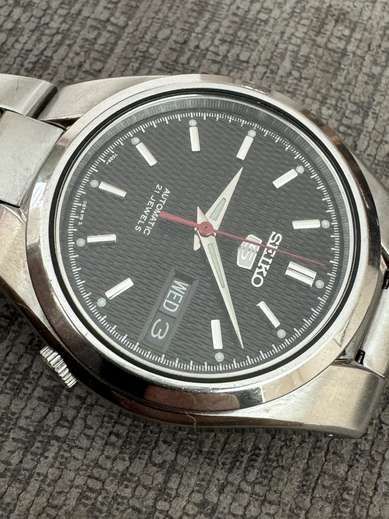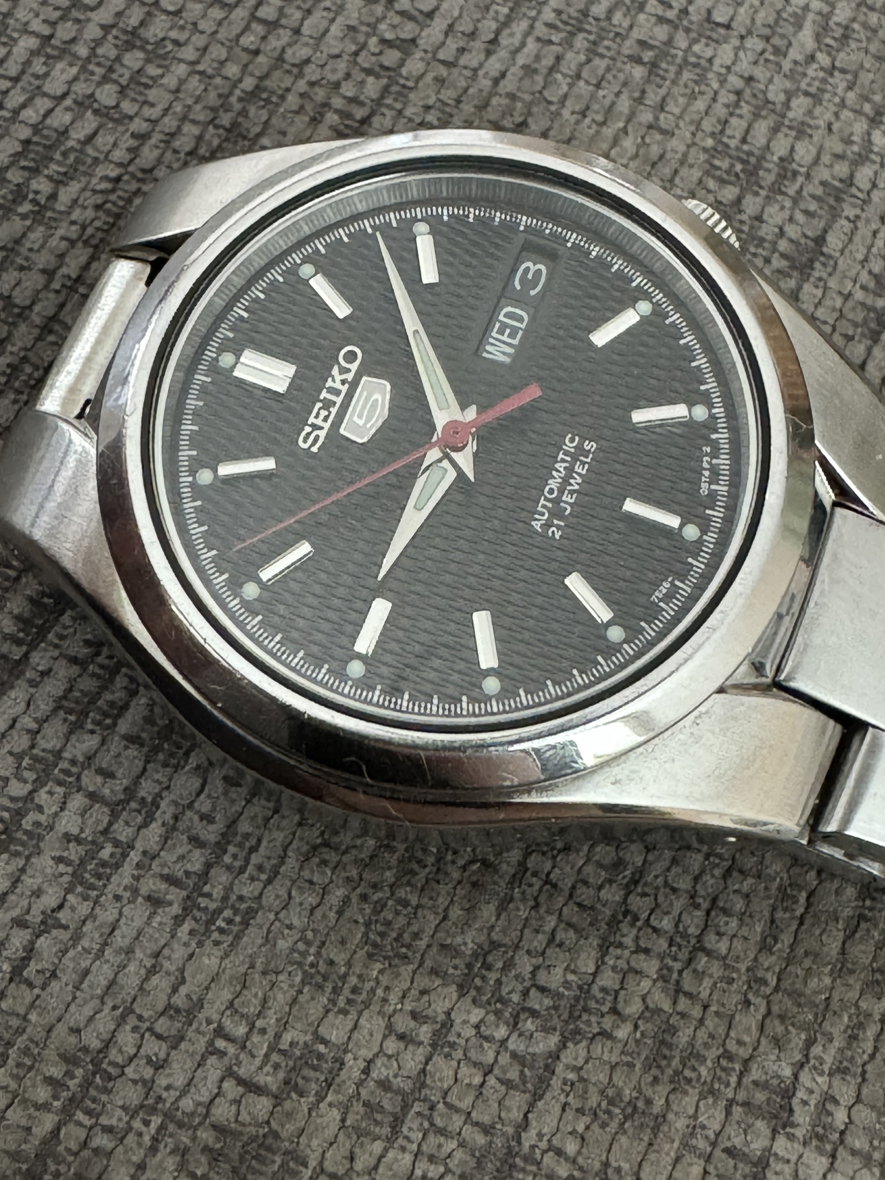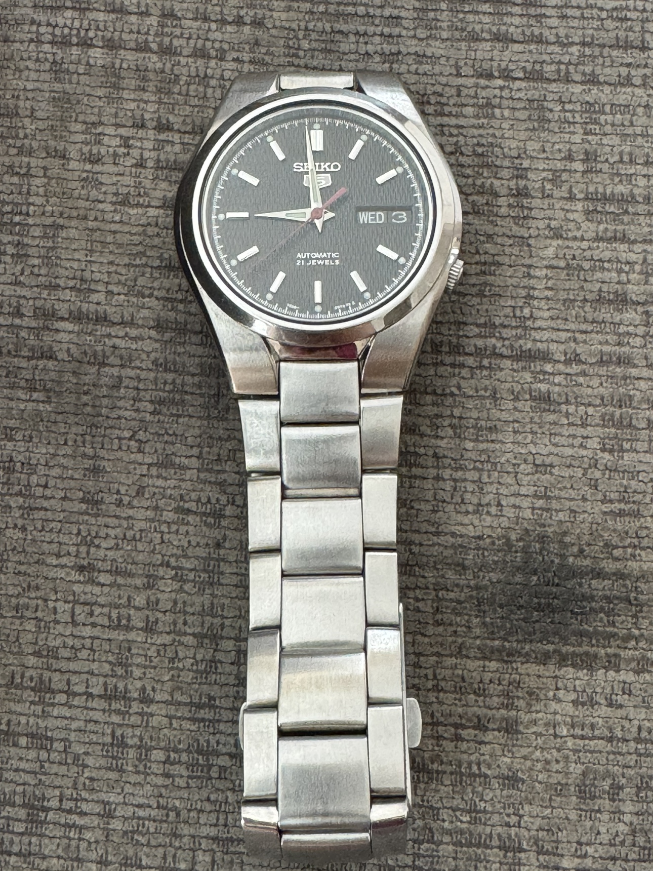 PLEASE READ DESCRIPTION FOR DETAILS AND SIZING BEFORE BUYING - Great condition, fully functional - 37mm across, up to 7.5” bracelet - Black textured dial - Automatic Price is firm. Pickup in Markham any day, North York Monday/Tuesday. No holds without deposit, first come first served. If you like this watch, check out my other listings for similar watches! Buy multiple for a small discount