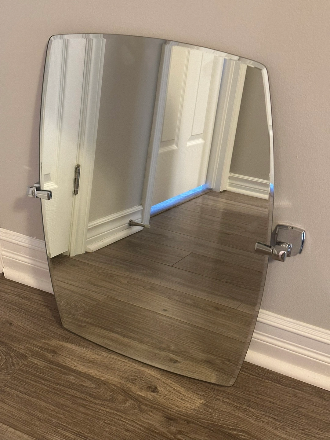 Secondhand frameless vanity mirror in great condition, but mounting brackets were misplaced when we changed out mirrors. You would need to replace.