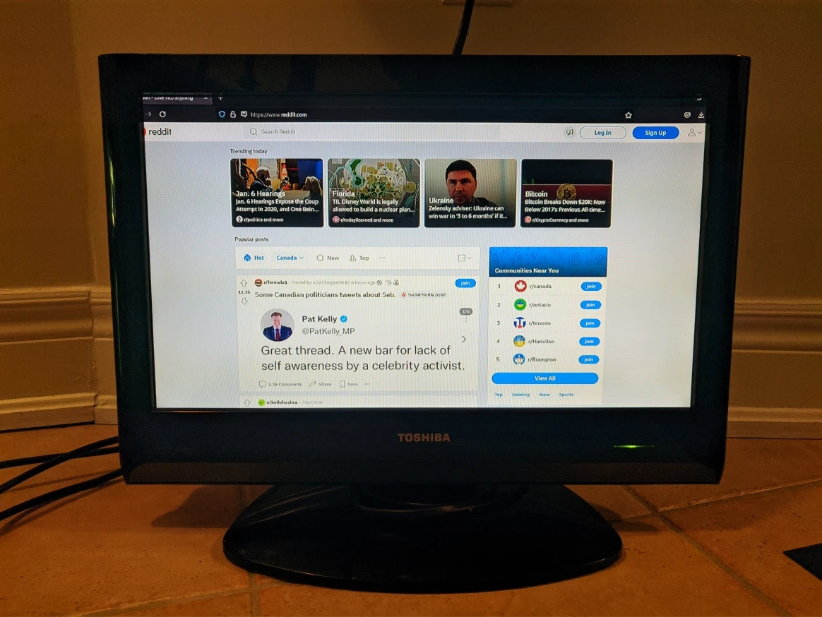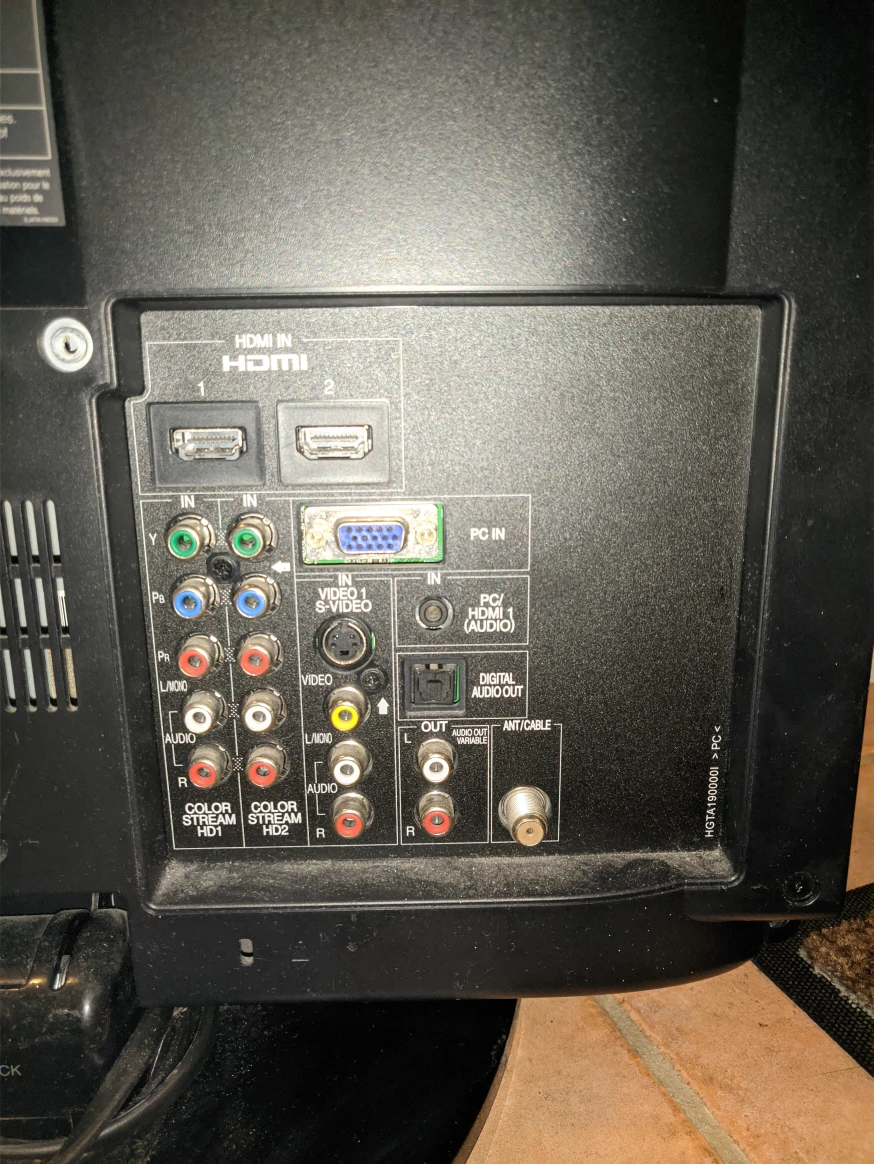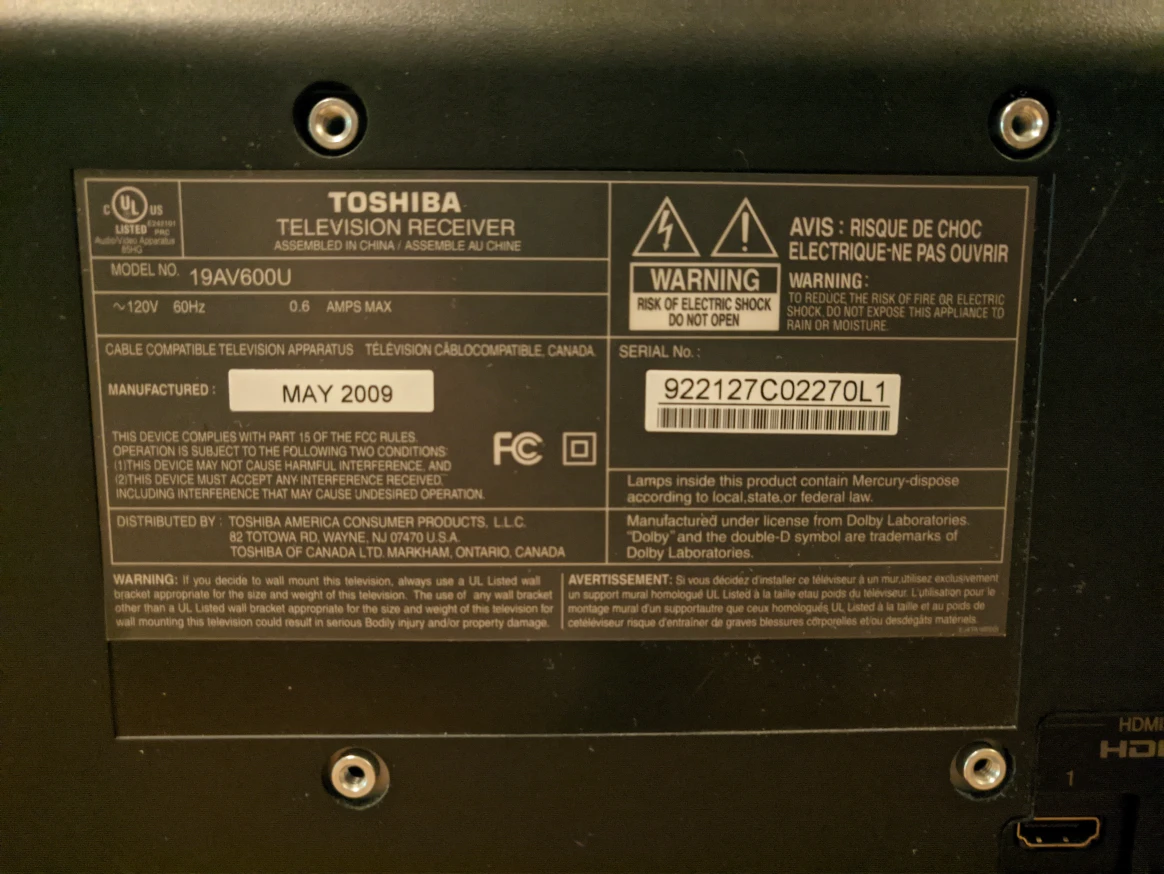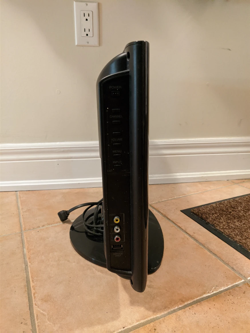 19 inch TV, good as a second monitor for a computer or as a small TV. 2 HDMI, VGA, and component inputs. Does not have a remote, does not include any video cables.