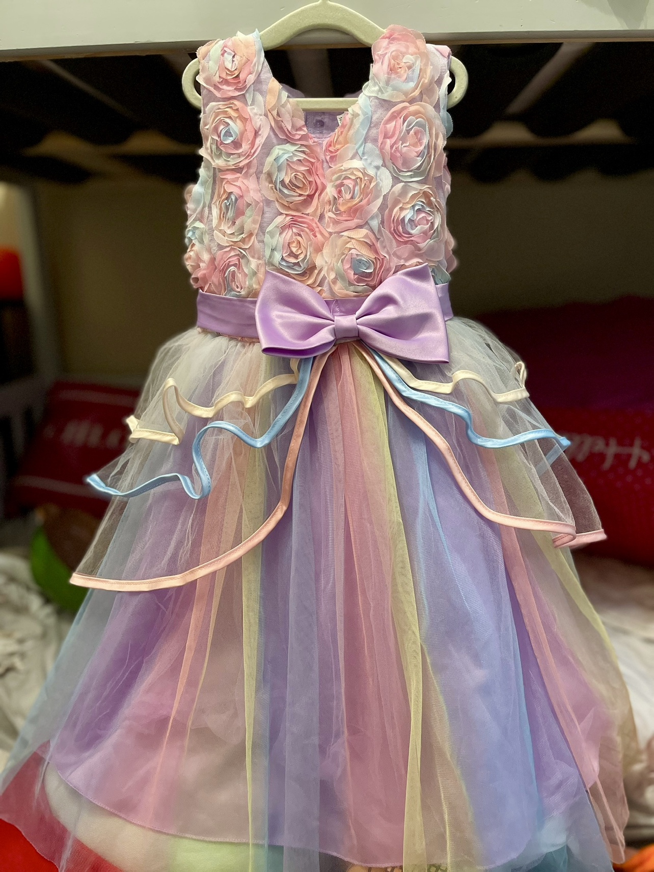 multi-layered rainbow tulle dress with a floral bodice and a purple ribbon. Size 140. Used once for photoshoot