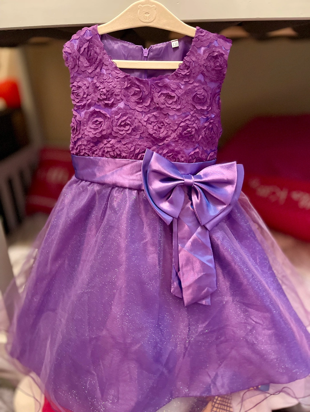 purple flower dress with a satin bow. It is sleeveless and has a tulle skirt with a glittery finish. The dress is in excellent condition. Size 130