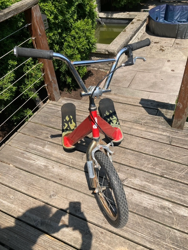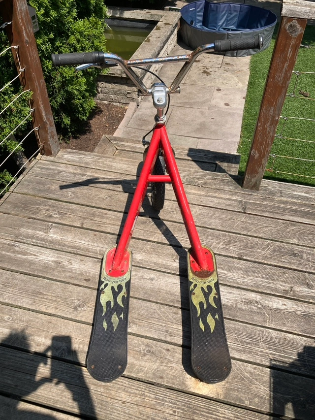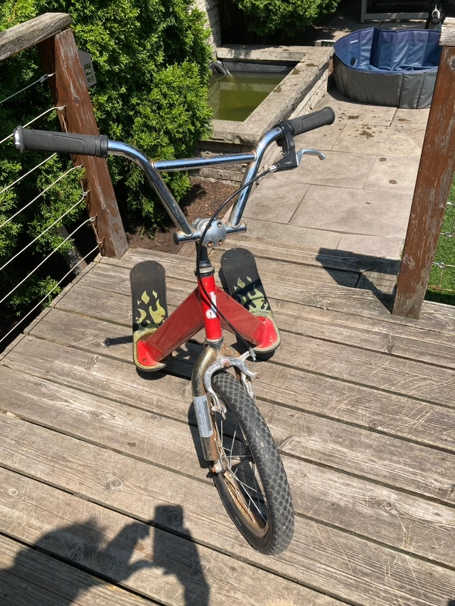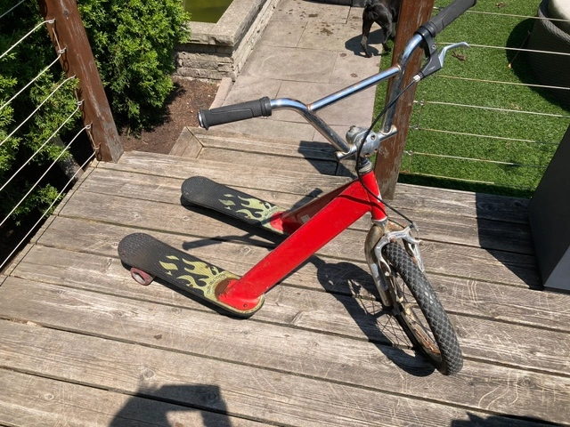 This was used indoors in a warehouse by adults as a quick way to get around the large space and as such is in quite good shape. There is some surface rust on the handle bars (which has new grips) and near the bottom of the struts, but it is 100% functional and structurally sound. Tire has been recently refilled. Description from the maker below. From the Manufacturer With the California Chariot, now you can experience the thrill that has been reserved for seasoned skateboard riders and in-line skaters.A cross between a BMX bike, two skateboards and a shopping cart, the California Chariot is a radically extreme scooter that excites children of all ages. It is as easy to ride as a shopping cart – just step on and glide. With three wheels and dual footboards, it boasts an unusually stable and smooth ride. But, with speeds reaching 18 mph on flat ground, kids have proven that the California Chariot can perform and endure even the most athletic and radical moves. California Chariot Red Metallic.