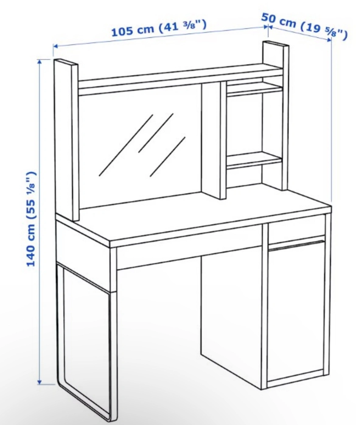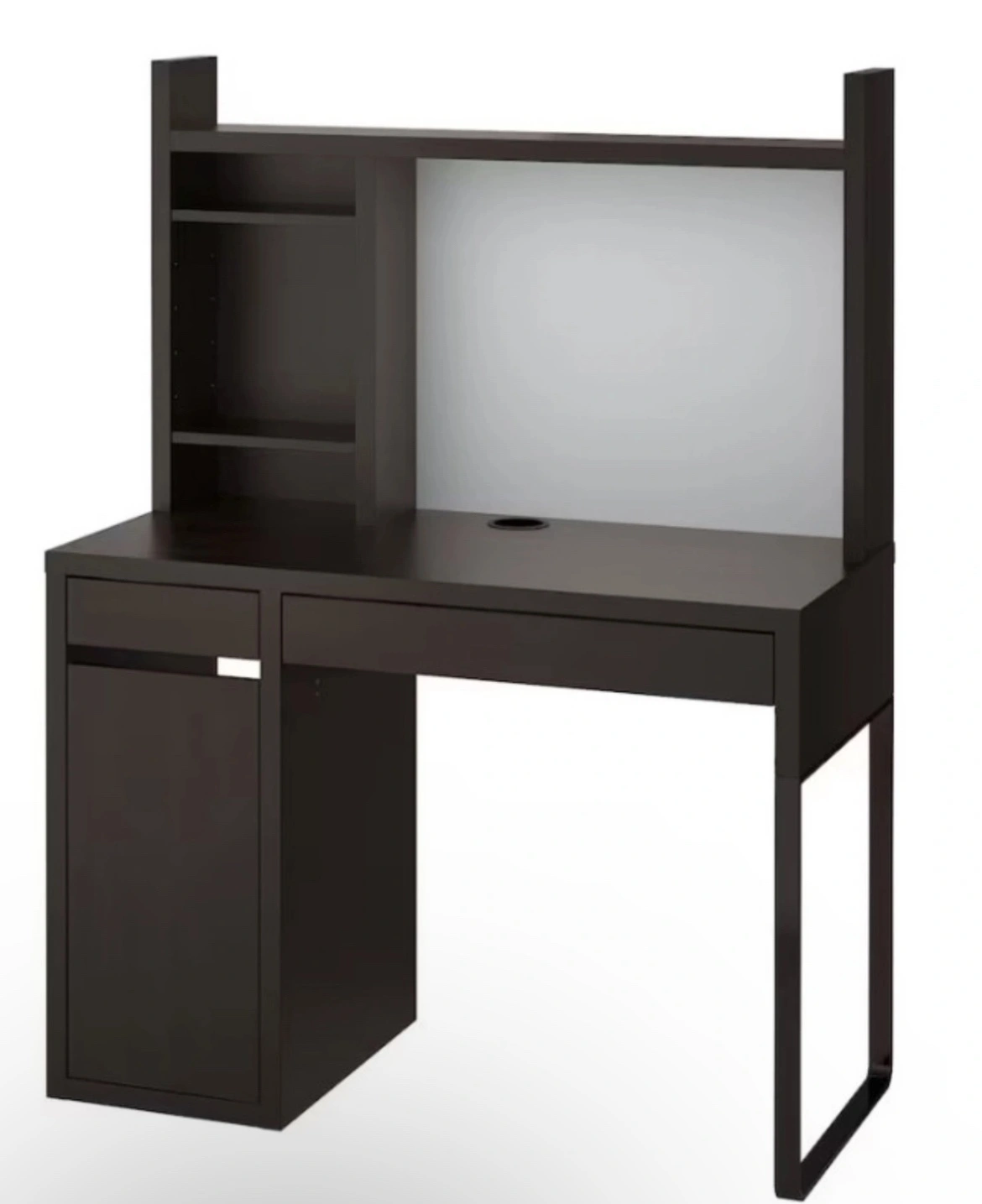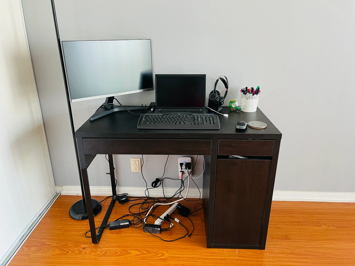 IKEA Micke Office Desk with attached book rack.