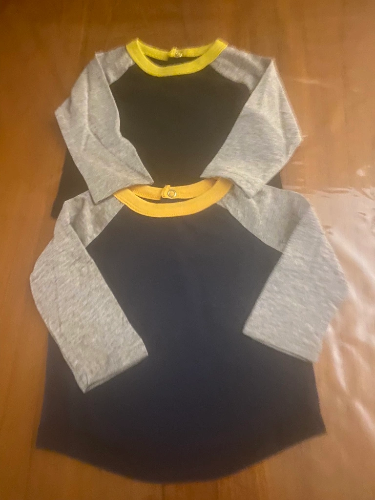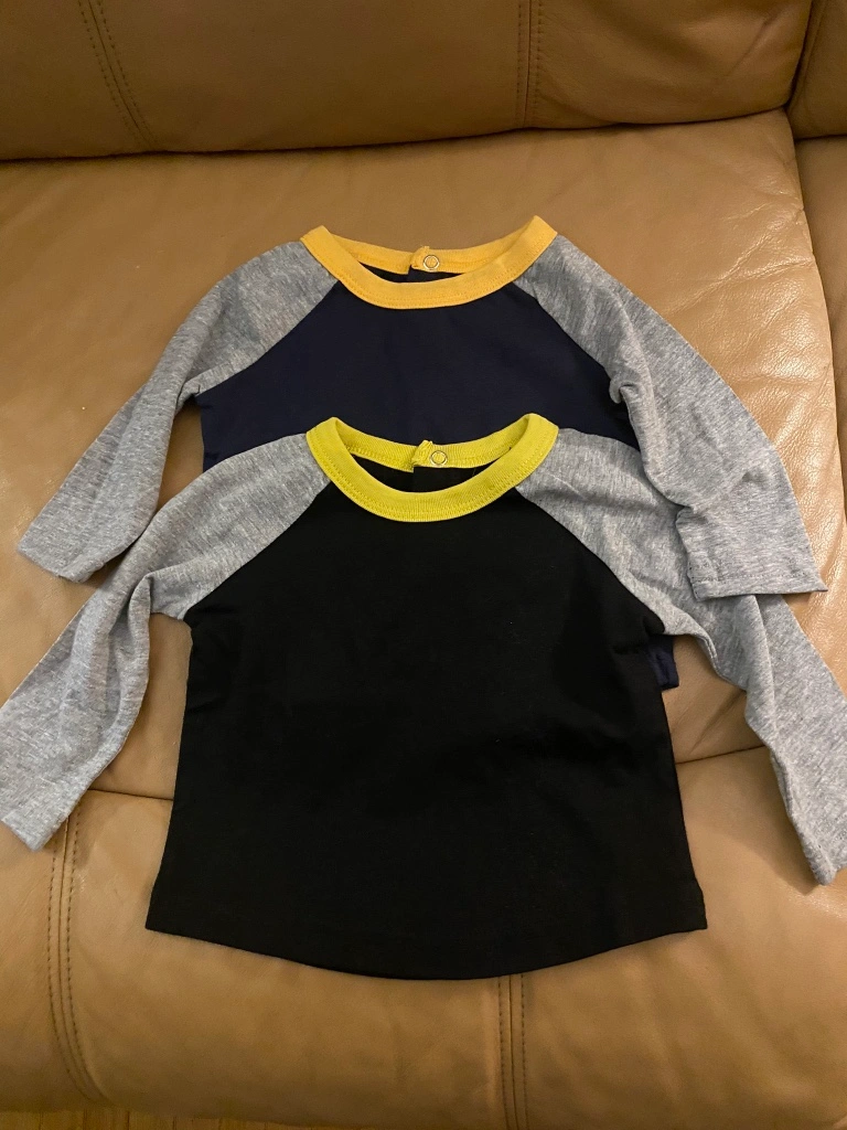 Two long sleeve tops, one blue, one black, up to 6 months. Brand new, never used. With Fall here these two tops can keep another baby warm. Free