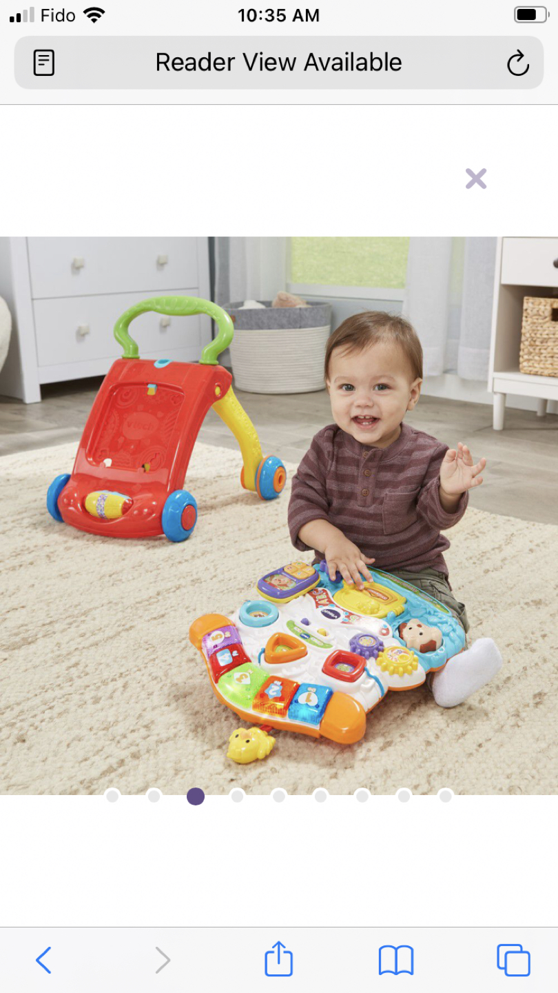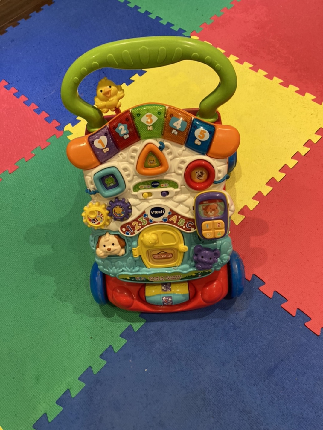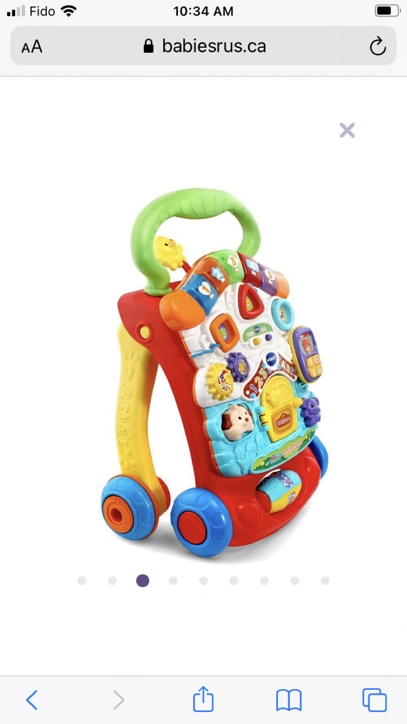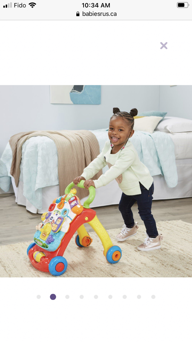 135• The easy-to-remove activity panel features five light-up piano keys, three colorful shape sorters, a removable cell phone, spinning gears and more. • Five chunky light-up piano key buttons introduce shapes and numbers in Learning Mode and play music notes and melodies in Music Mode. • Meet six friendly animals through interactive play and hear their unique voices and sounds. • Adjustable two-speed control switch on the wheels allows walker to grow with your little one's changing needs. • Magic sensor triggers sounds and cheerful melodies as your child walks along. For more info visit: https://www.babiesrus.ca/s/toys-ca/en/VTech-Stroll-and-Discover-Activity-Walker---English-Edition/9E946670.html?gclid=EAIaIQobChMItMakup68-AIV5HZvBB27zQ8eEAQYAyABEgKXbvD_BwE