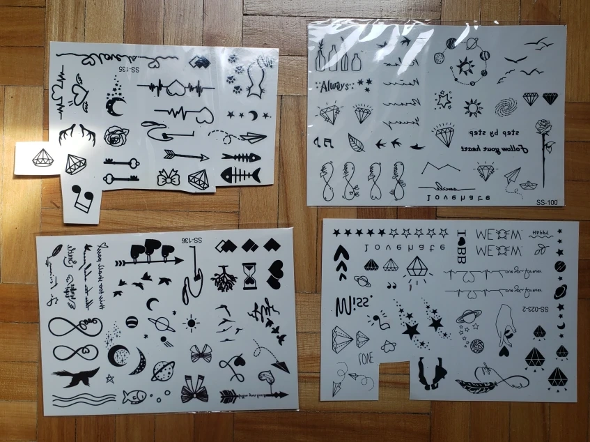 A variety of small temporary tattoo sheets, perfect for a fun night out or a special occasion!